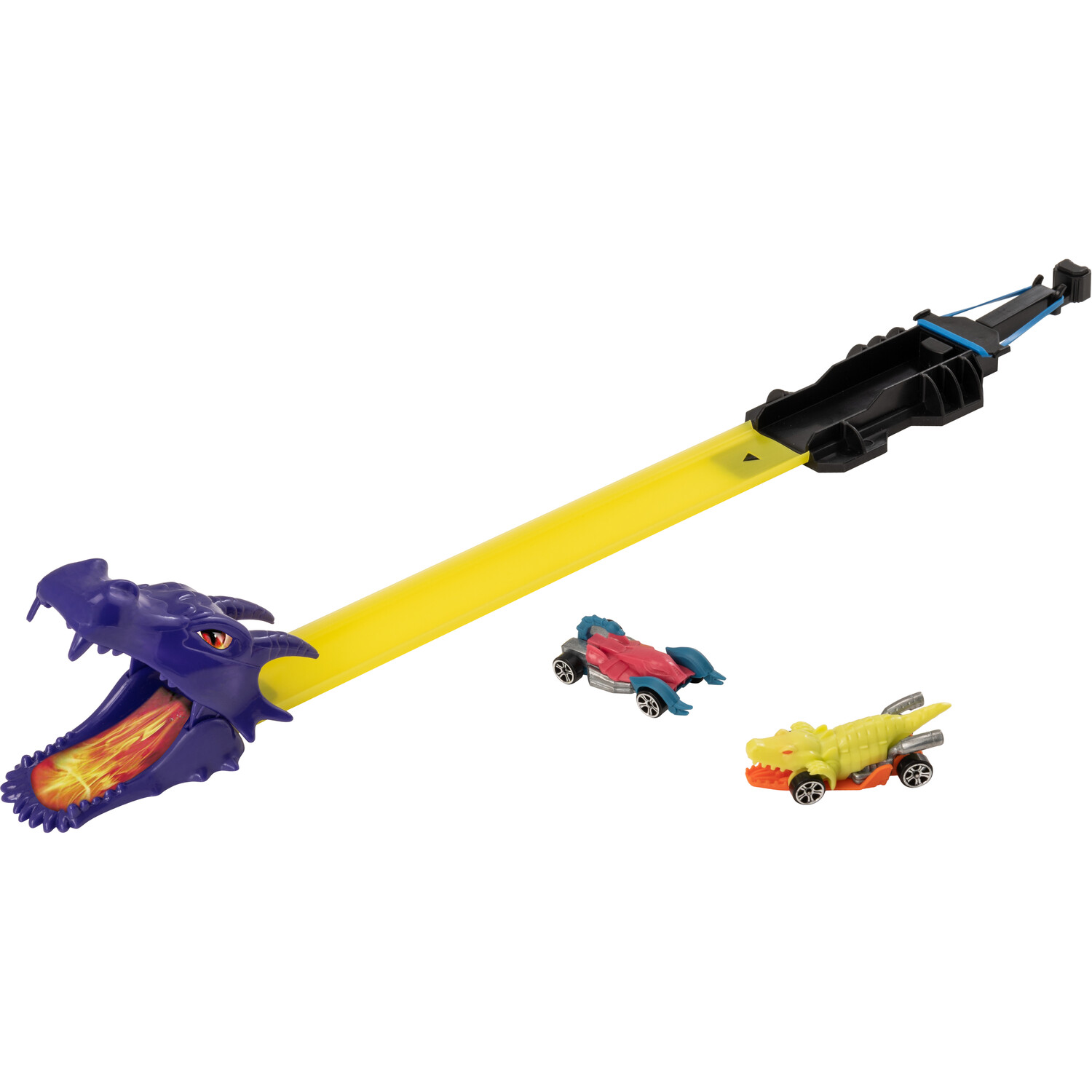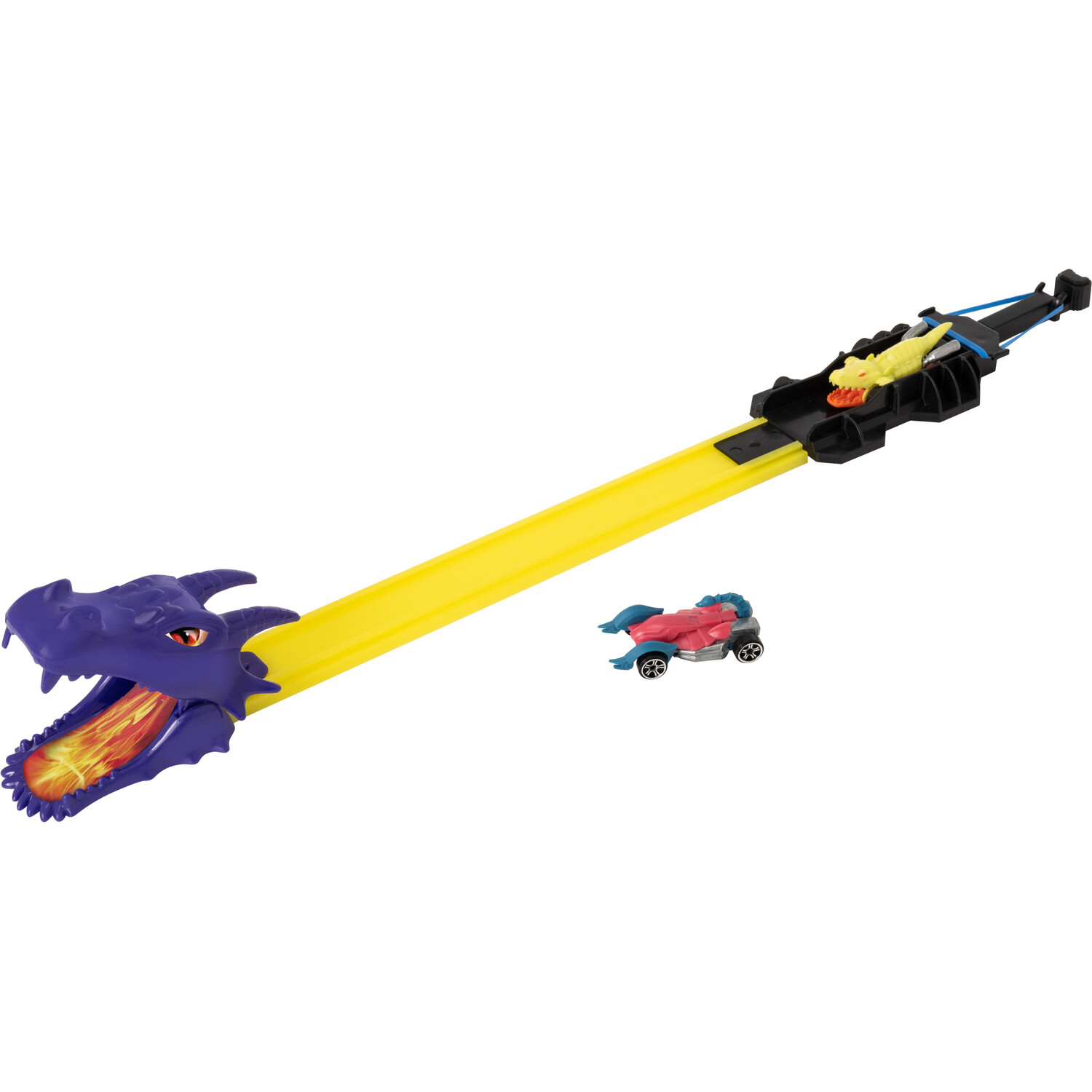 Escape the dragon's roar with the Teamsterz Dragon Blast with two cars! Launch your car and race down the track to jump through the fire-breathing jaws of the dragon! This Track Set features a pull-back elastic launcher, a single-lane race track with a dragon head jump and two die-cast cars for immediate play! It's the perfect gift for any enthusiastic little racer, offering hours of imaginative fun!