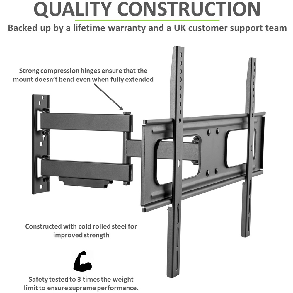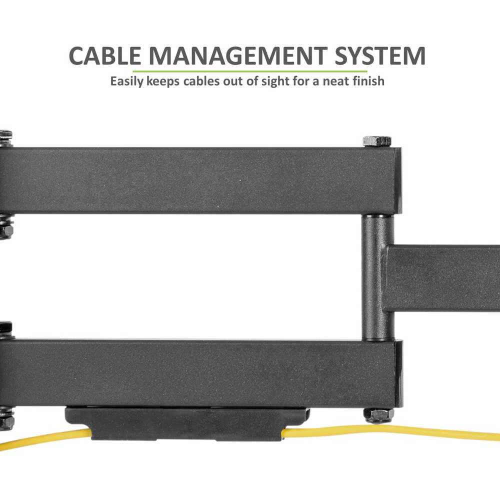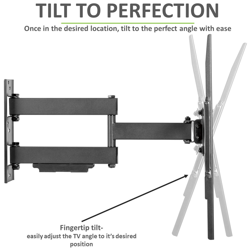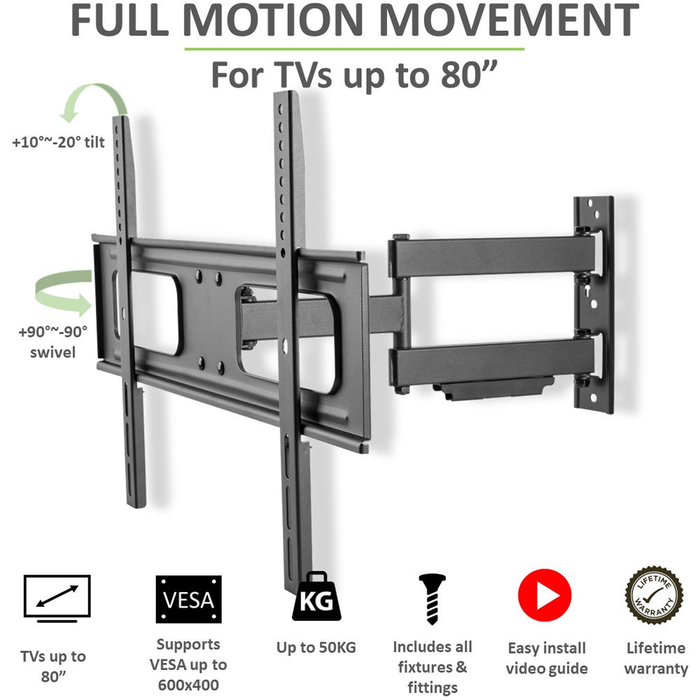 Place your TV at the best viewing spot with the Tech ART Mounts TV Wall Mount Bracket. This wall mount bracket is perfect for you if you want to save space in your home by avoiding having your TV placed on a stand or a cabinet. You can mount televisions from 37 inches up to 80 inches with a 50kg weight capacity. This mount is ideal for getting the best and unobstructed view of your screens, wherever you need entertainment. Experience a broad range of movements with an extension from the wall up to 47.3cm along with swivel movements up to 180° and tilt movements from plus 10 degrees to minus 20 degrees. The TV can be adjusted up to three degrees clockwise and anti-clockwise to ensure perfect alignment providing optimal flexibility for your viewing preferences. Keep your cables tidy and out of sight with the built-in cable management system that provides an elegant finish to your entertainment area. The package includes full fittings and a detailed instruction manual, ensuring a straightforward installation into solid and single stud walls. Accommodating VESA sizes of 200 x 200, 400 x 200, 300 x 300, 400 x 400, and 600 x4 00mm, this mount ensures compatibility with various TV brands and sizes. Enjoy added peace of mind with a lifetime warranty.