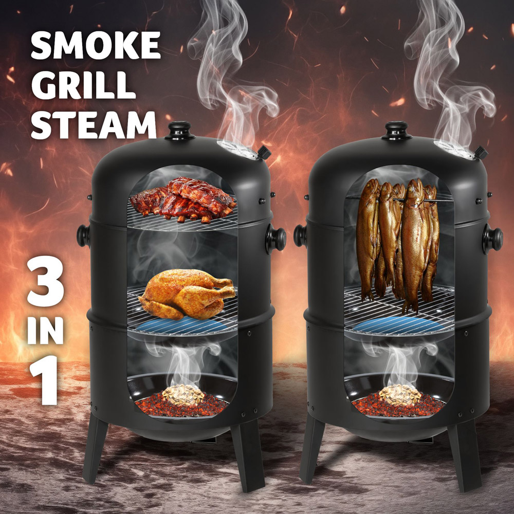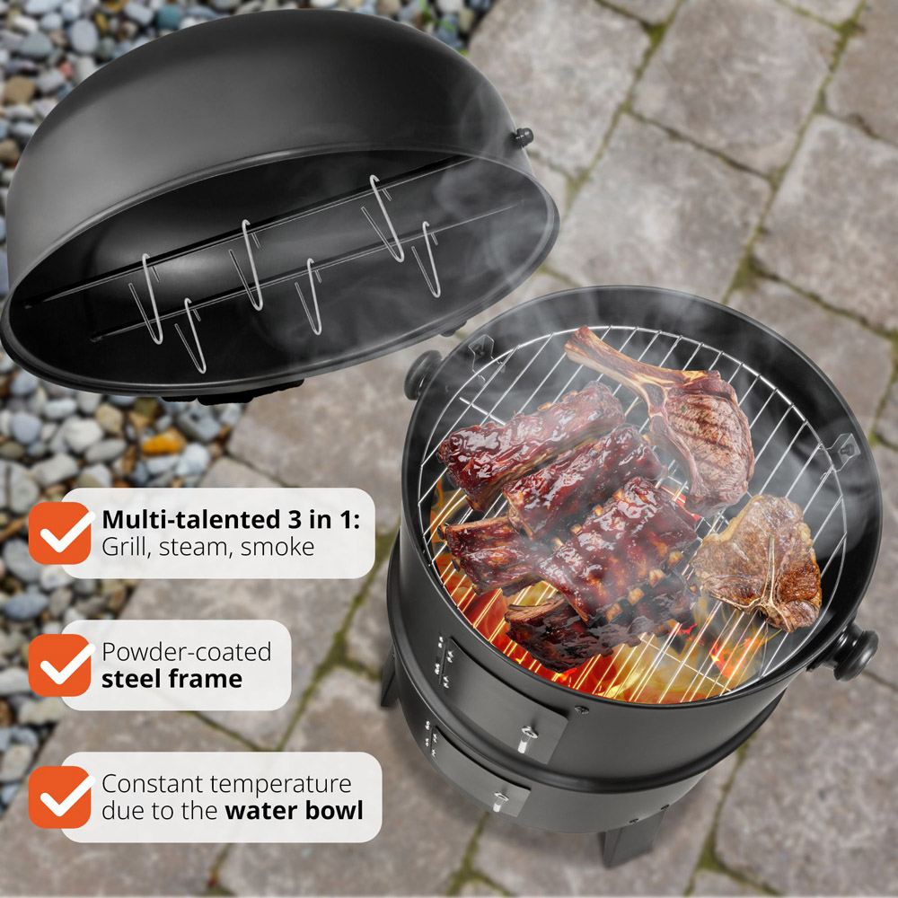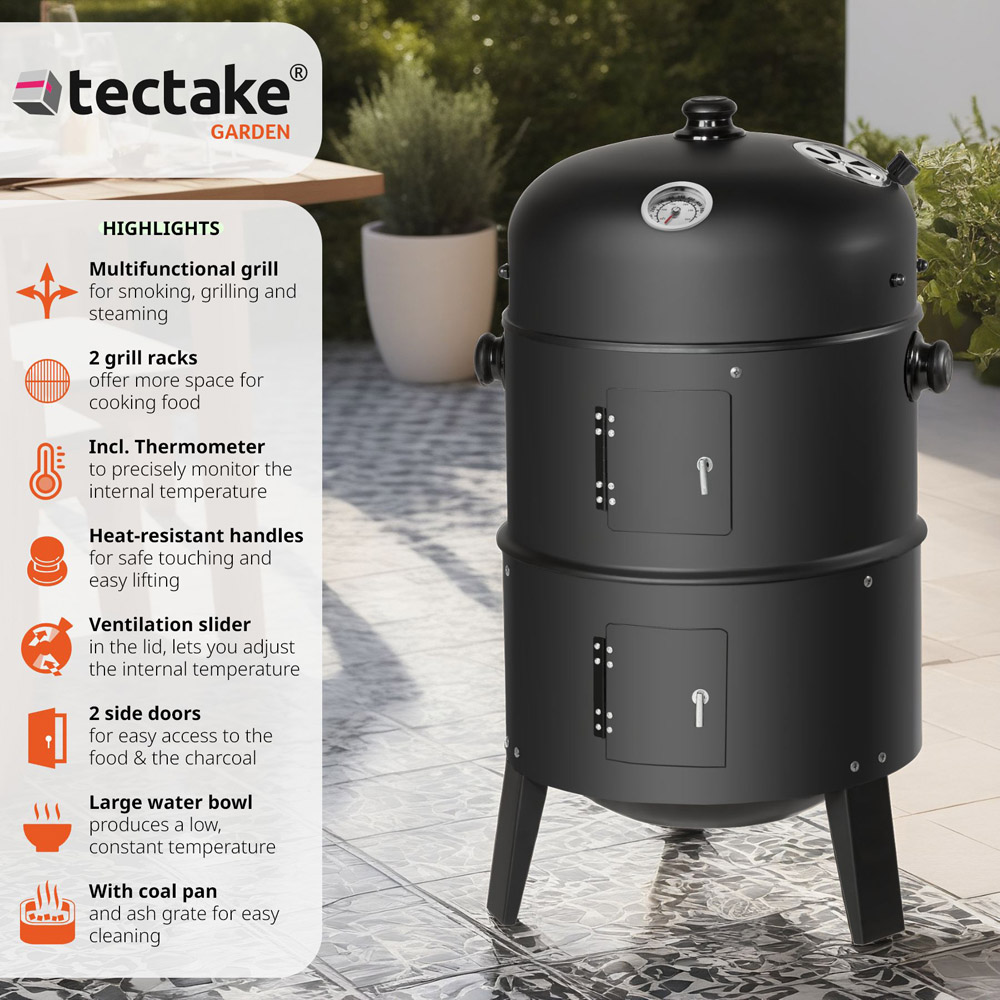 The 3-in-1 BBQ from tectake allows you to smoke, grill and barbecue to perfection, letting you take your outdoor parties to the next level compared with other single-function smokers, grills, ovens, and BBQs. The classic smoker uses wood or charcoal as fuel to maximise flavour and has 3 different levels to grill, cook, and smoke to your desired temperature. The two grills are 37 cm in diameter to provide enough space to cook for your family, friends, or neighbours. No need for further accessories as the included thermometer on the lid displays the temperature, which can be regulated using the side and lid vents. The integrated water tray keeps the temperature at a constant low to perfectly smoke or can be used to steam vegetables. The quick setup and ease of use promise great smoking and outdoor barbecue fun.