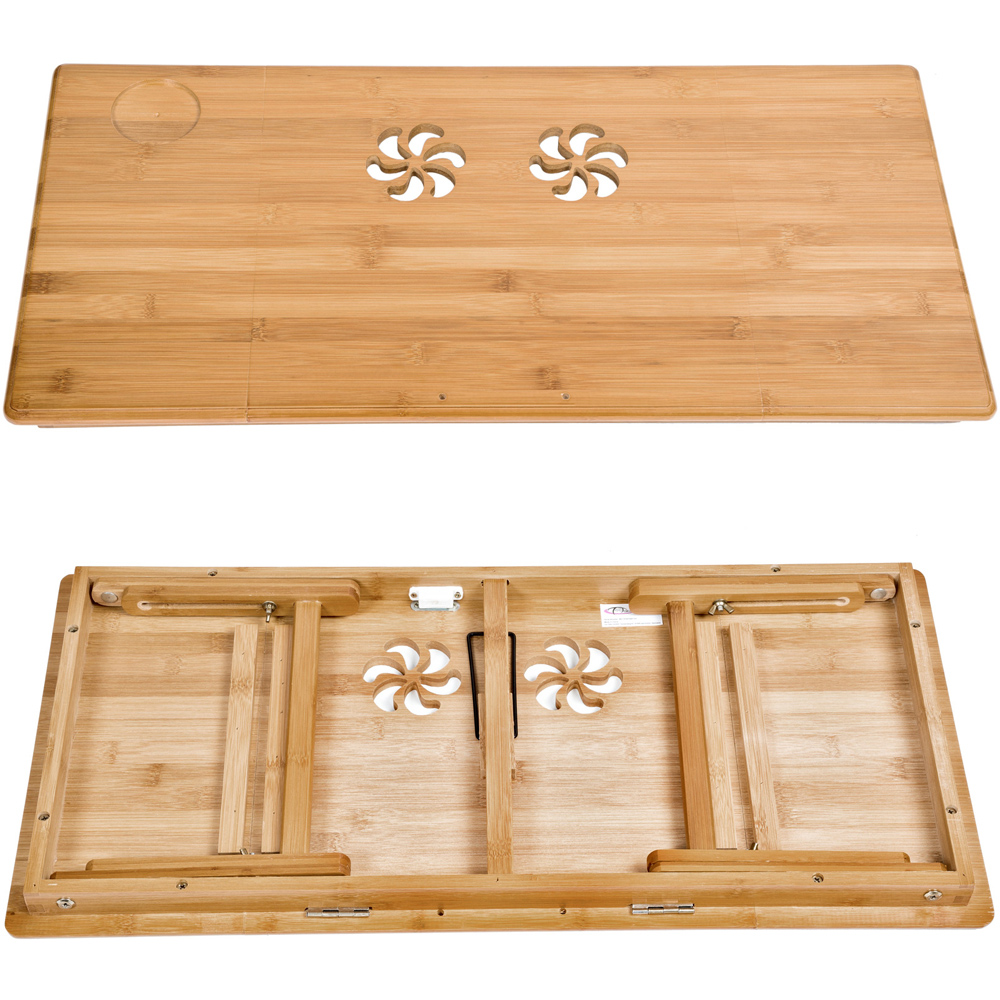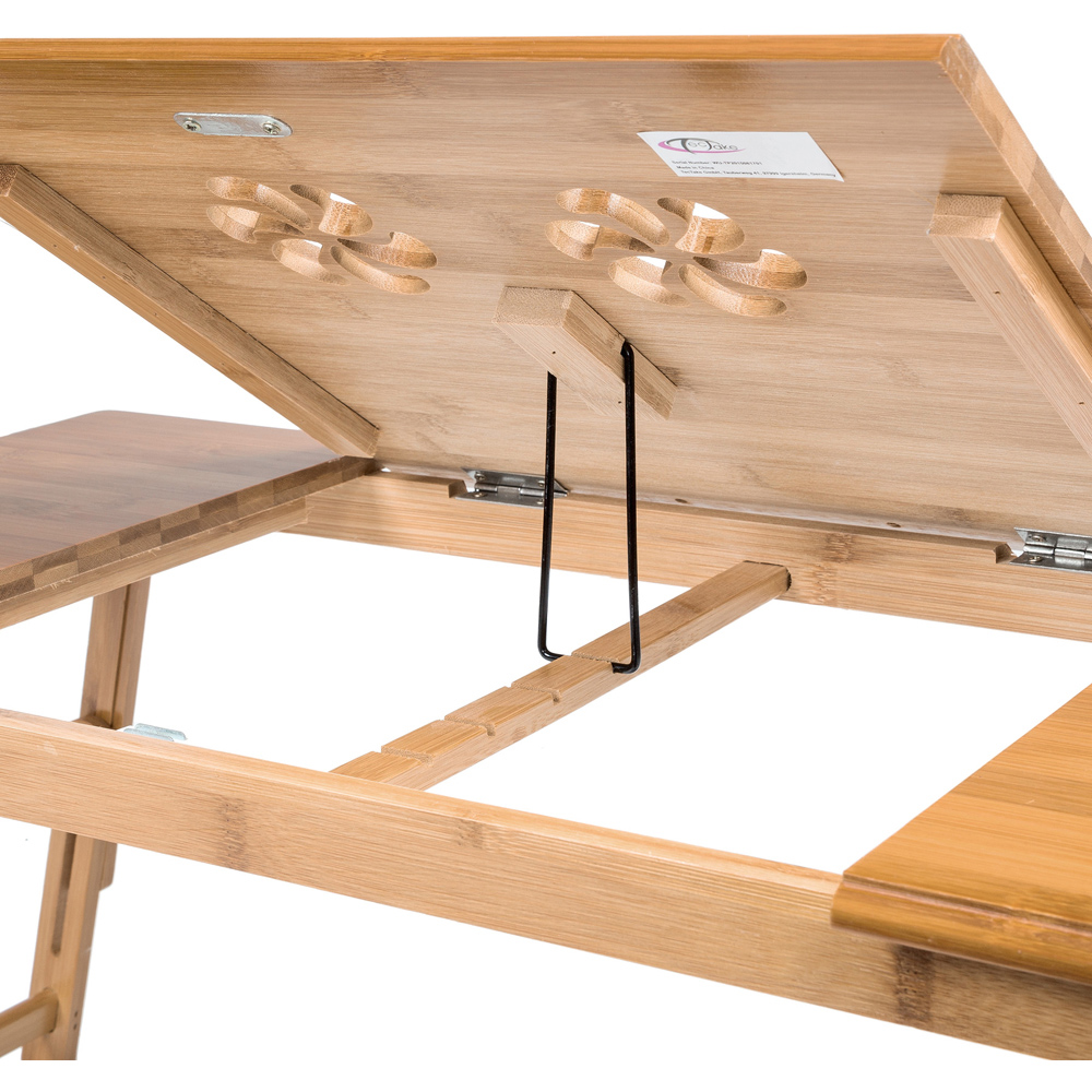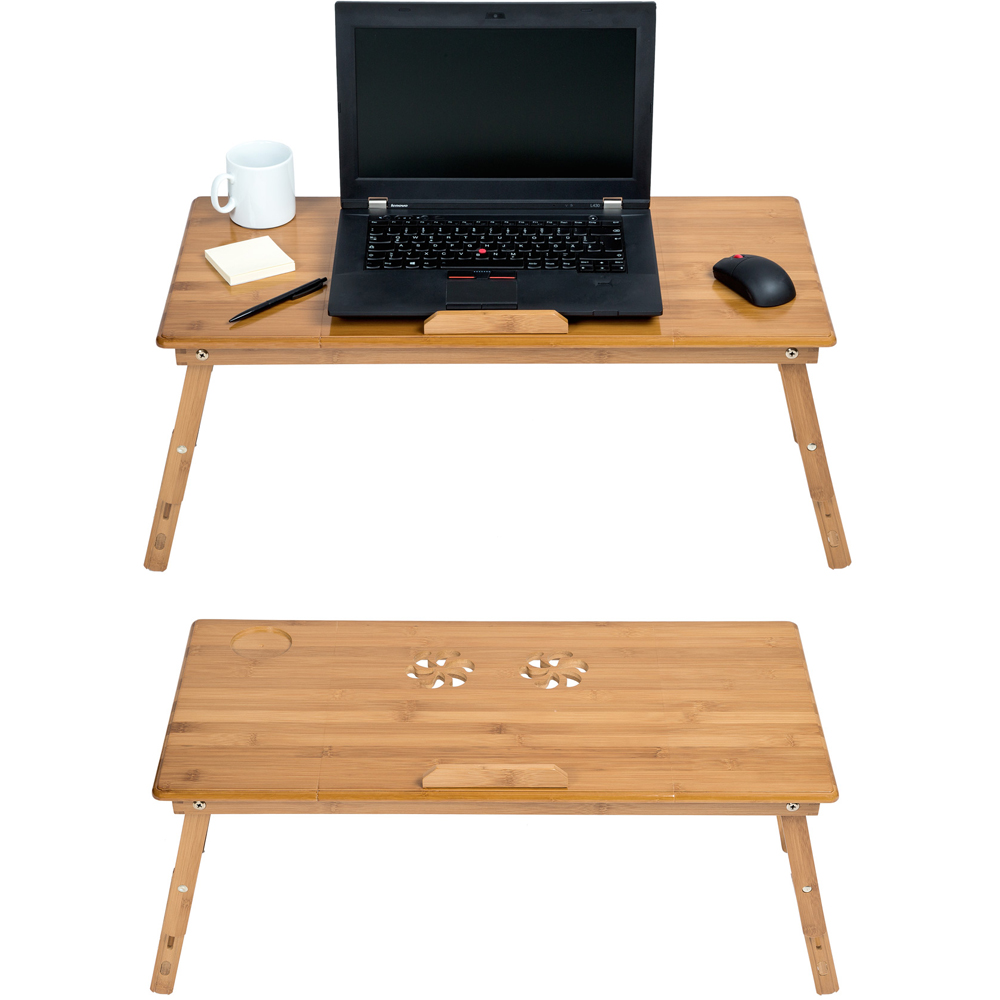 This practical laptop stand by tectake makes your working day easier and improves the quality of your free time, enabling you to work comfortably, surf, play, or chat. The work surface is tiltable and the entire table is height adjustable, so you can set up the table specifically to your desired posture. The laptop stand is made of sturdy bamboo wood and is gloss lacquered. Particularly practical in this laptop stand are the storage areas on both sides next to the foldable laptop area. The laptop stand by tectake is the perfect companion for relaxed surfing at home and while traveling.