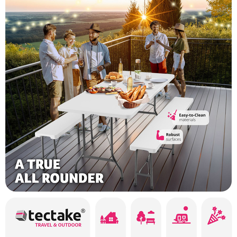 This large dining table and bench set from tectake is an ideal addition to the equipment bags for any keen outdoors person. This dining table and bench brings a bit of homely comfort to the outdoors in no time at all - simply unfold it and sit down, ready for dinner. The surfaces are made of plastic and have rounded corners for protection, especially essential for families with small kids. The robust frame made of painted steel gives the easy-care set great stability, high resilience and good structural strength. Packed, the three-part camping set can be carried comfortably by the side handles and, thanks to its small dimensions, can also be stored away easily within the tent without taking up much space. This dining table and bench set is the perfect way to relax in front of a view of the countryside after a busy day of walking and riding bikes, so get yours from tectake today.