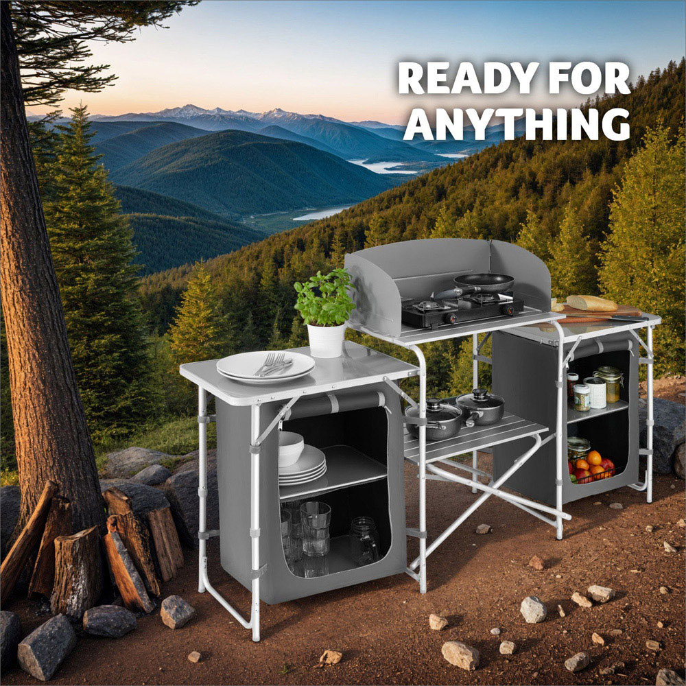 Whether you're camping in a tent or caravan, this portable camping kitchen is your essential companion. Easily set up and folded away, with adjustable feet, heat-resistant work surface, practical windbreak, and three closable storage compartments, your camp chef will be ready to go whilst others are sleeping. They provide a dedicated space for all your cooking needs whilst packing down into their included bags. With ample organised storage compartments, our camping kitchen keeps your utensils, cookware, and ingredients in order. The easy-to-assemble furniture allows efficient meal prep whilst keeping your dining tables free. This kitchen is equipped with all the accessories you need for a memorable camping journey. Don't compromise on comfort during your travel adventures and invest in the tectake outdoor Camping Kitchen.