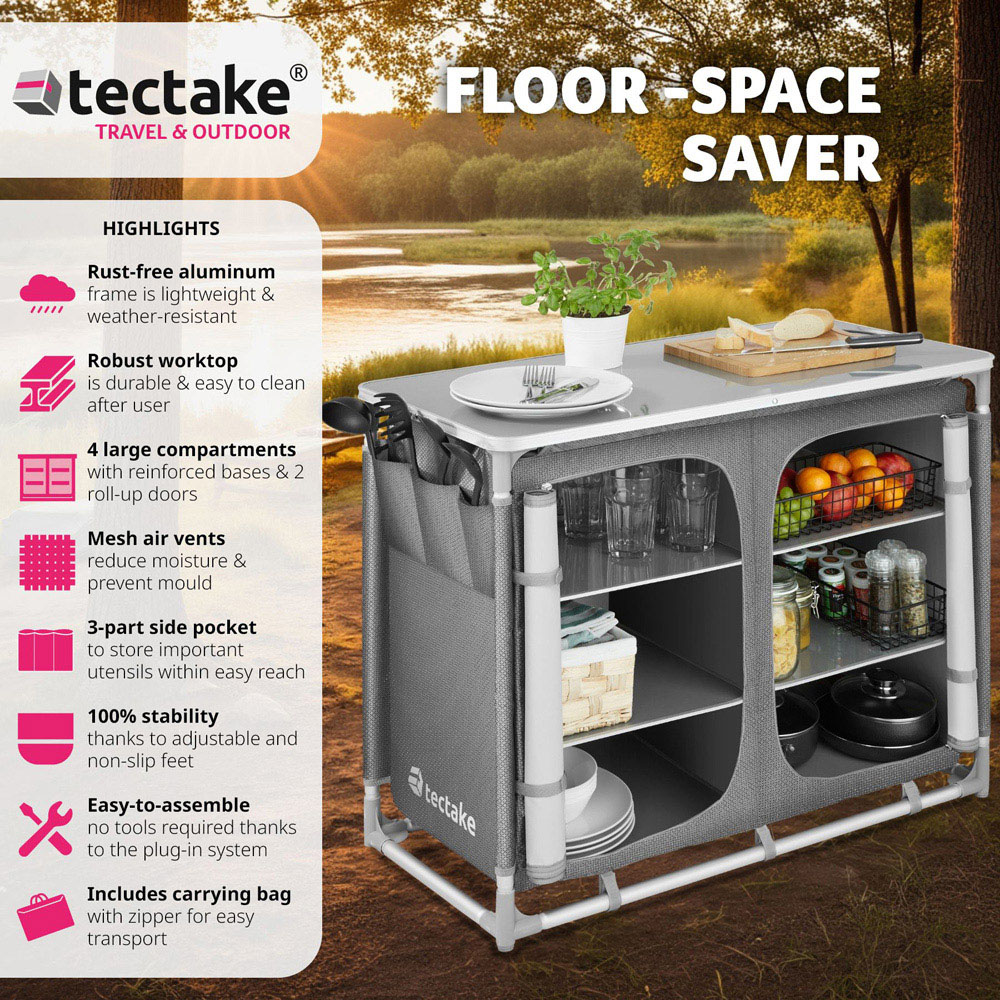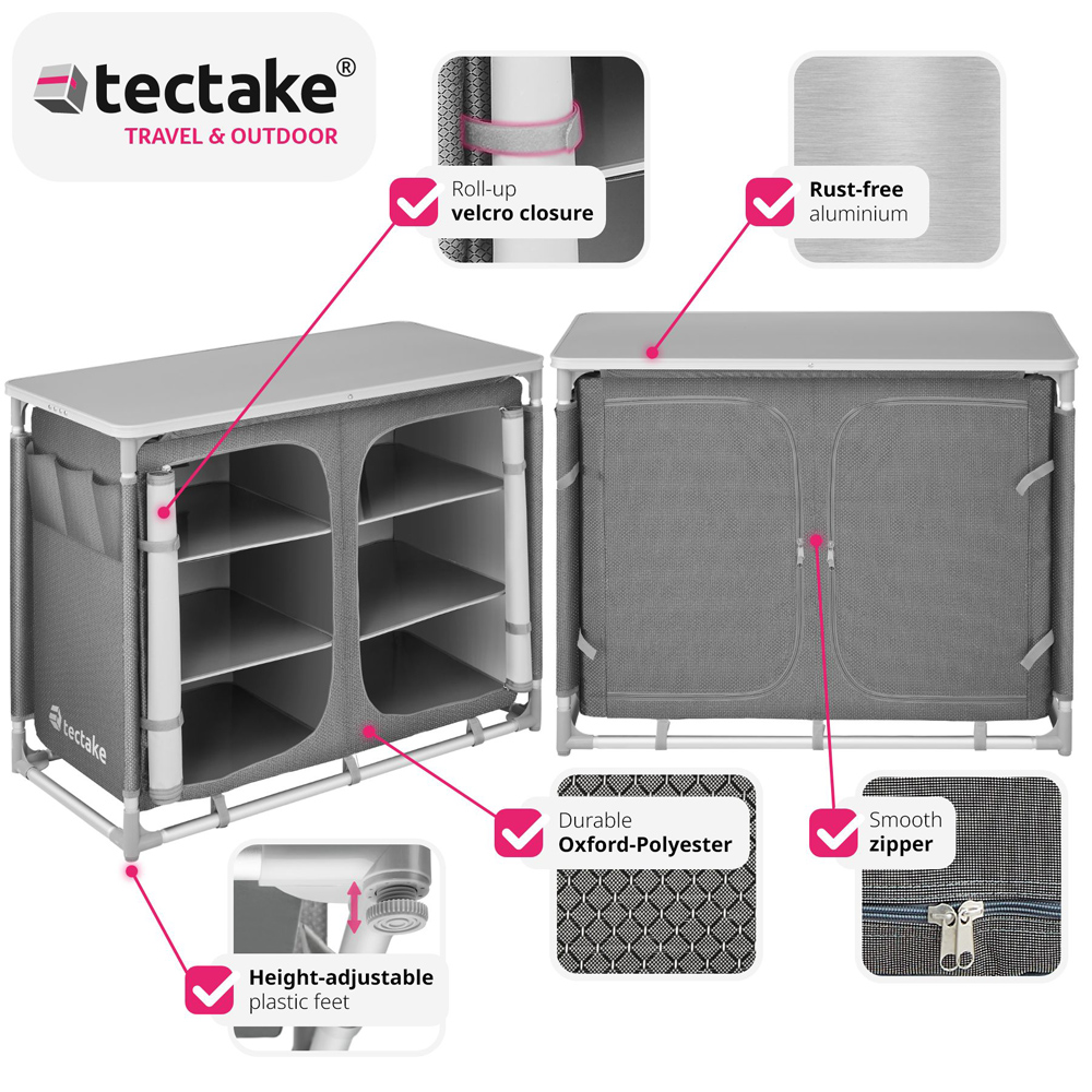 This practical camping kitchen is easy to assemble, foldable and provides plenty of storage in a small footprint, including a robust worktop/shelf, three side pockets, and six large compartments with mesh backs for ventilation. Plus, the lightweight frame and individually adjustable legs mean the outdoor furniture is stable on any campsite. With our Portable Camping Cupboard, you have the solution for outdoor organization and convenience. With designated shelves and compartments, it keeps your sleeping bags, cooking equipment, clothing, and tent accessories easily accessible. Plus, the camping cupboard transforms your campsite into a functional kitchen with a built-in countertop and storage, making meal prep, cooking, and dining in the great outdoors a breeze. Upgrade your camping game today and experience the convenience our cupboard brings to your outdoor lifestyle. It's easy to pack, transport, and set up, making it perfect for tents, travel, and outdoor adventures. Enjoy outdoor cooking and dining with the clean and elevated surface it provides. Protect your gear and supplies from the elements while staying organized, and well-prepared. Whether you need to store gear, create a camp kitchen, or simply stay organized while travelling, our Portable Camping Cupboard is your trusted companion for all your outdoor endeavours.