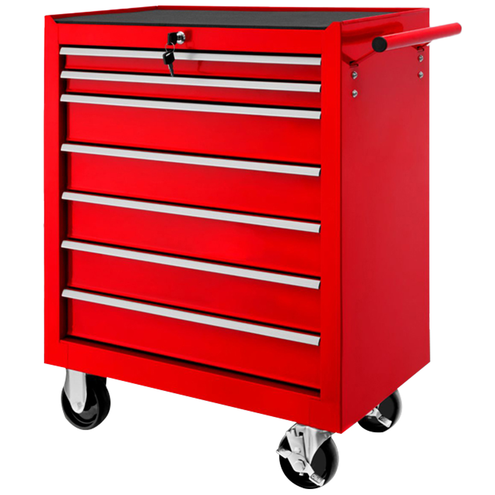 Enhance your workspace efficiency with this robust red tool chest, featuring seven drawers and a central locking system. Ideal for both professional tradespeople and DIY enthusiasts, this mobile tool storage solution ensures your tools are secure, organised, and easily accessible. Constructed from powder-coated steel for durability and rust resistance, it includes four solid wheels for effortless mobility around your workshop or garage. The chest's design incorporates ball-bearing mounted rails for smooth drawer operation and a substantial 150kg loading capacity, making it perfect for storing everything from small hand tools to larger equipment.