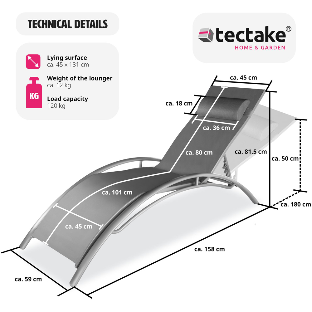 Welcome to your very own summer paradise with this tectake Set of 2 Grey 5 Step Backrest Sun Lounger with Head Cushion. A sun lounger is the perfect piece of outdoor furniture to enjoy the sun from the comfort of your own home. An attractive look, functionality and robust design are combined in the curved lines of this lounger chair. The backrest can be adjusted into five positions, while your head can gently rest on the soft cushion. The aluminium frame doesn't just make this low-maintenance construction extremely stable and weather-resistant but also ensures the lounger is lightweight. These outdoor chairs are perfect accessories for your garden so you can enjoy hours of relaxation in the sun.