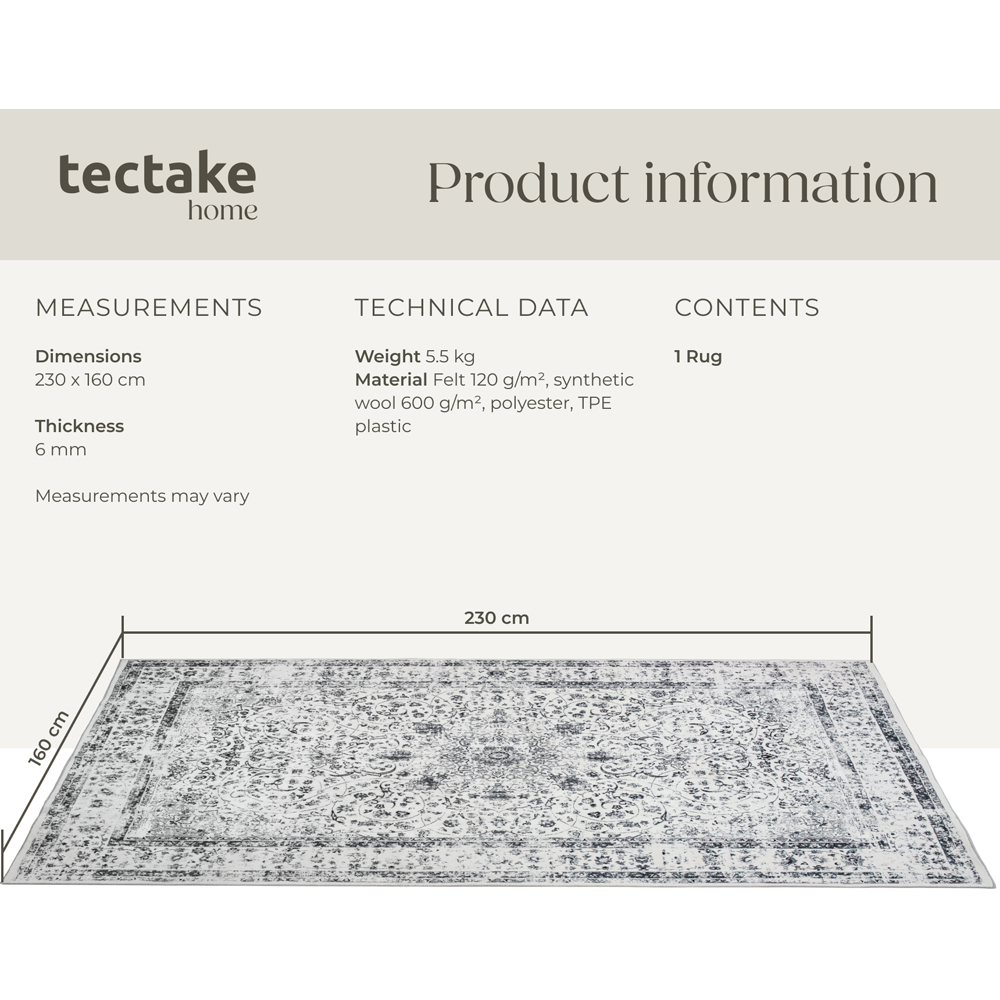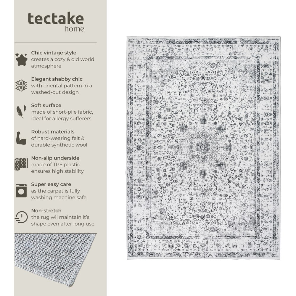 Elevate your home decor with the timeless elegance of the Washable Rug Aliya, featuring a vintage oriental pattern that seamlessly blends into any room. Its subtle blue, black, and grey hues, coupled with a washed-out effect, create a sophisticated yet cosy atmosphere in spaces such as living rooms, bedrooms, or hallways. Enjoy the soft, short-pile surface that not only offers a comfortable underfoot experience but also benefits allergy sufferers with its non-allergenic properties. The non-slip TPE plastic underside ensures the rug stays firmly in place, enhancing safety and ease of maintenance. This durable rug is designed for convenience, being machine washable, thus ensuring it remains a cherished part of your home for years to come.