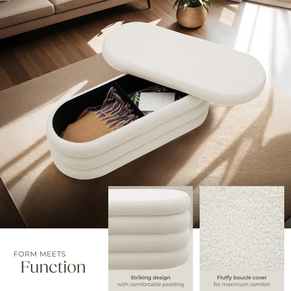 Elevate your home decor with this Tectake Altu Boucle Upholstered Bench. The Altu upholstered bench with boucle cover from tectake is more than just a practical seat. It combines cosy design in the trendy Scandi style with the highest functionality and is the perfect addition for anyone who values a tidy home. Whether in the living room, hallway or bedroom: this piece of furniture blends harmoniously into any room. Attractive combination. The elegant bench allows you to efficiently organise your living space without having to sacrifice style and comfort. Under the removable lid is a generous storage space, divided into two equally sized compartments, providing room for cushions, blankets or other home accessories. The piece of furniture is therefore not only a visual highlight, but above all a real must-have for organisation heroes. Sitting like on clouds. The gem also impresses with its cosy padding made of high-density foam and an easy-care, cuddly soft boucle cover, which gives the bed bench a particularly pleasant feel. Whether as an additional seat or as a comfortable footrest, this all-rounder ensures relaxing moments. Solid construction The robust base made of MDF panels guarantees a high load-bearing capacity and enormous stability. In conjunction with the non-slip, floor-protecting plastic caps, the upholstered bench ensures absolute stability. Charming design for every living style With its clear lines, the Altu upholstered bench from tectake fits perfectly into all living concepts. Whether you use it as a seat in the hallway or as a bed bench in the bedroom: it impresses with its versatility and ensures a cosy factor in your home.