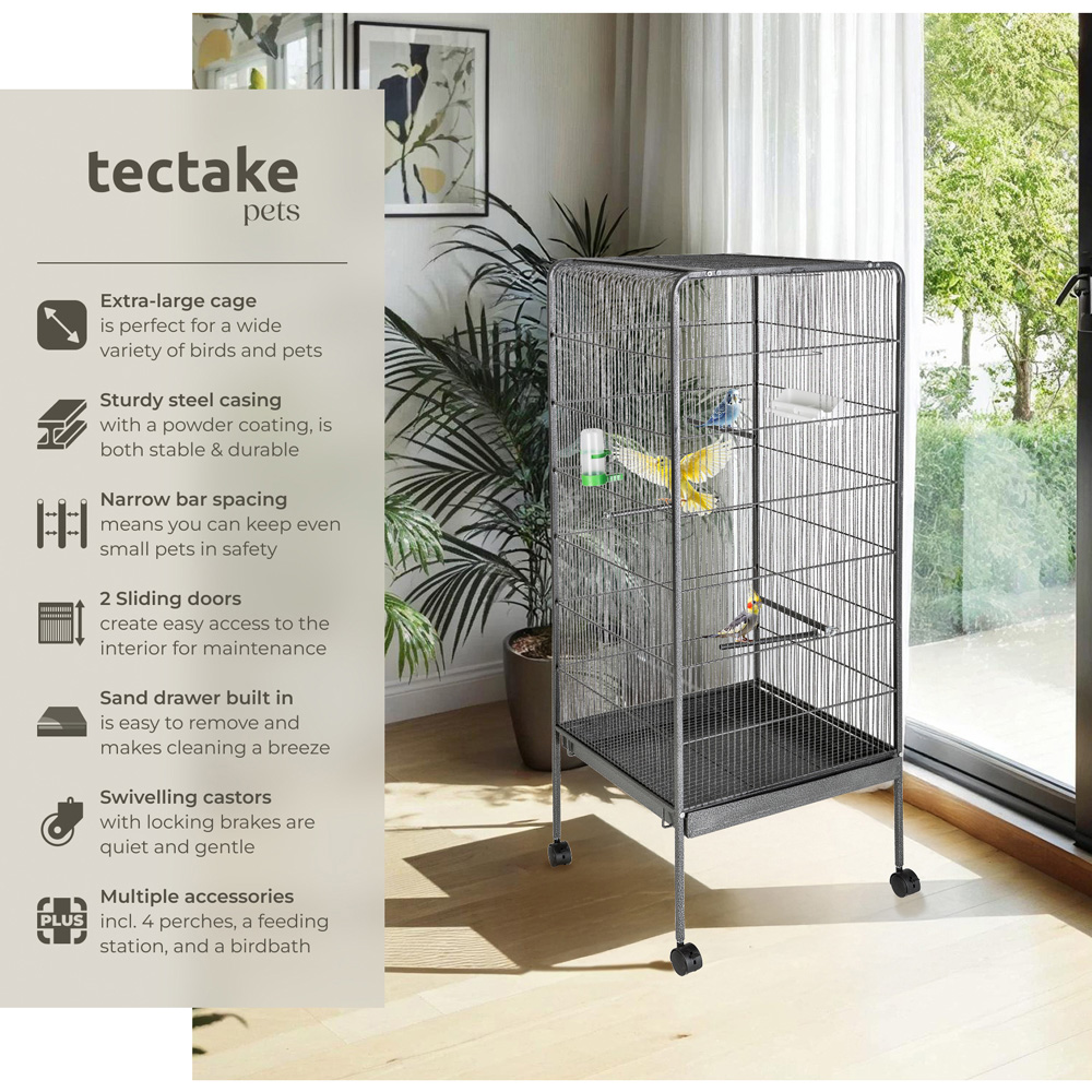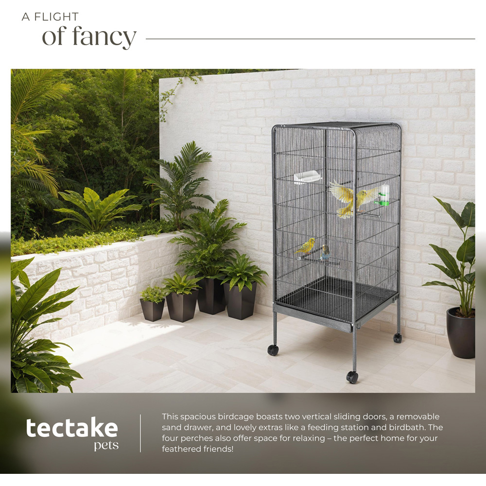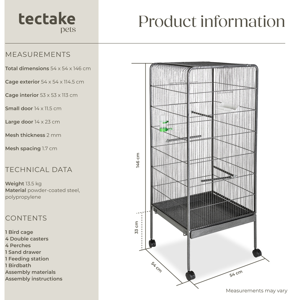 This bird cage is equipped with numerous perching platforms, including a feeding perch, meaning that your small feathered friends can relax and feed to their hearts content. The close bar spacing means that the aviary is ideal for containing small birds such as canaries and budgies, whilst the vertical sliding doors means you can let your birds out to spread their wings whenever it is safe to do so. It is important to provide your birds with enough space so remember to always check animal welfare regulations to ensure the cage is large enough for the number of birds and species you keep. When it comes to cleaning, the convenient sliding tray makes it easy and safe. The tray can be filled with sand which can be removed easily at any point to keep the cage hygienic. The grilled base ensures that the cage is kept completely secure whilst cleaning is completed. The bird cage is even equipped with wheels meaning it can be quickly moved, ensuring your beautiful birds are always close by.