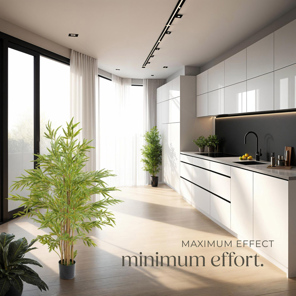 Breathe life into any room with this stunning 150cm realistic artificial bamboo plant, a perfect blend of beauty and practicality. This faux bamboo tree from tectake boasts high-quality leaves that mimic the look and colour of real bamboo so closely, it's almost indistinguishable from the genuine article. Housed in a robust plastic pot that ensures stability and durability, this artificial plant requires minimal upkeep, simply wipe the leaves to keep it dust-free. It's an ideal choice for anyone wanting to enjoy the lush, green allure of bamboo without the hassle of maintenance, making it a superb addition to both living and office spaces.