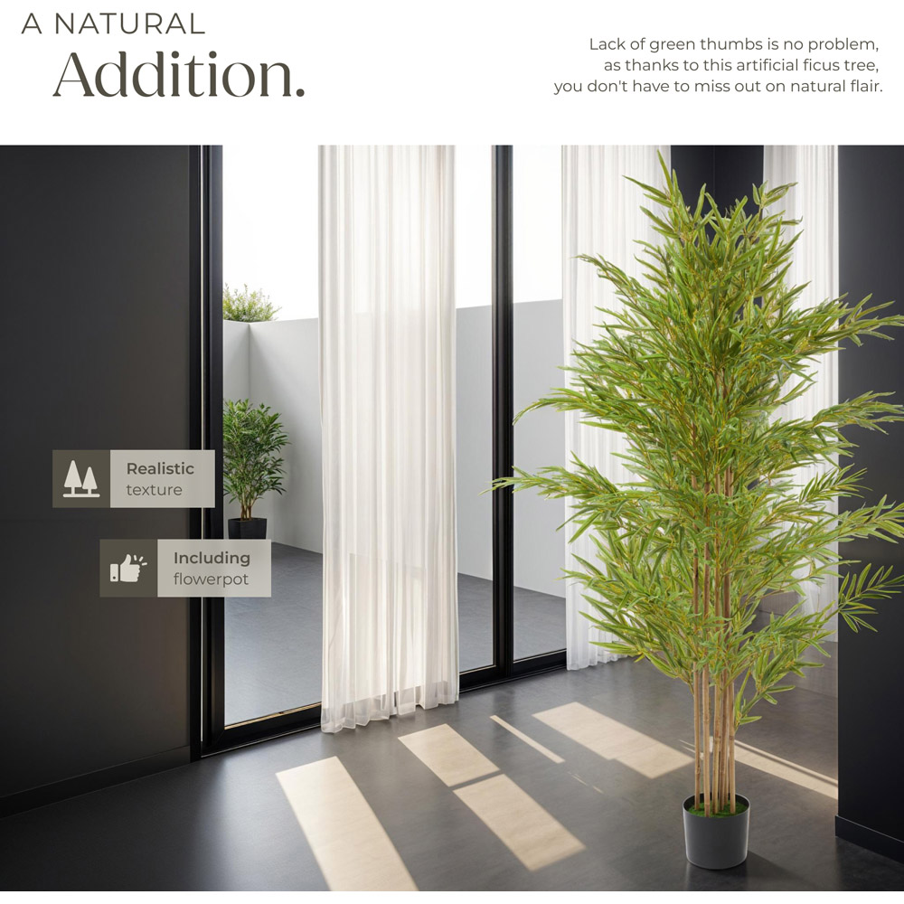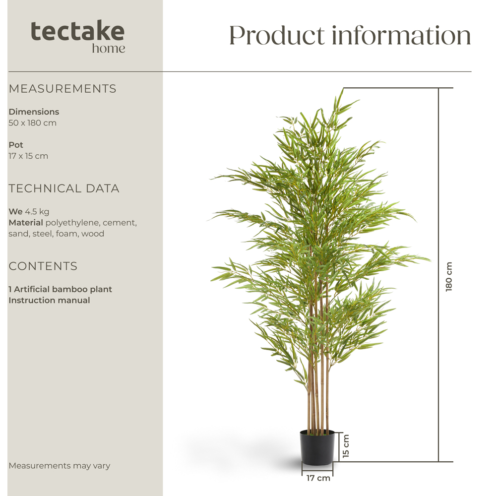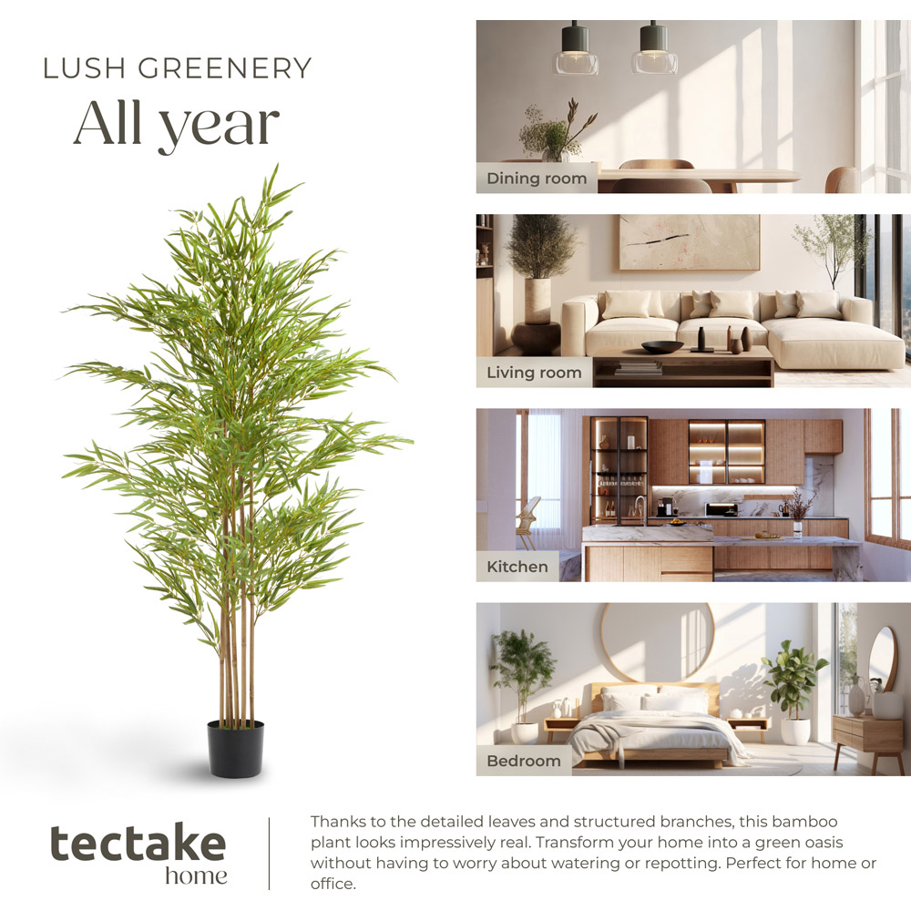 Breathe life into any room with this stunning 180cm realistic artificial bamboo plant, a perfect blend of beauty and practicality. This faux bamboo tree from tectake boasts high-quality leaves that mimic the look and colour of real bamboo so closely, it's almost indistinguishable from the genuine article. Housed in a robust plastic pot that ensures stability and durability, this artificial plant requires minimal upkeep, simply wipe the leaves to keep it dust-free. It's an ideal choice for anyone wanting to enjoy the lush, green allure of bamboo without the hassle of maintenance, making it a superb addition to both living and office spaces.