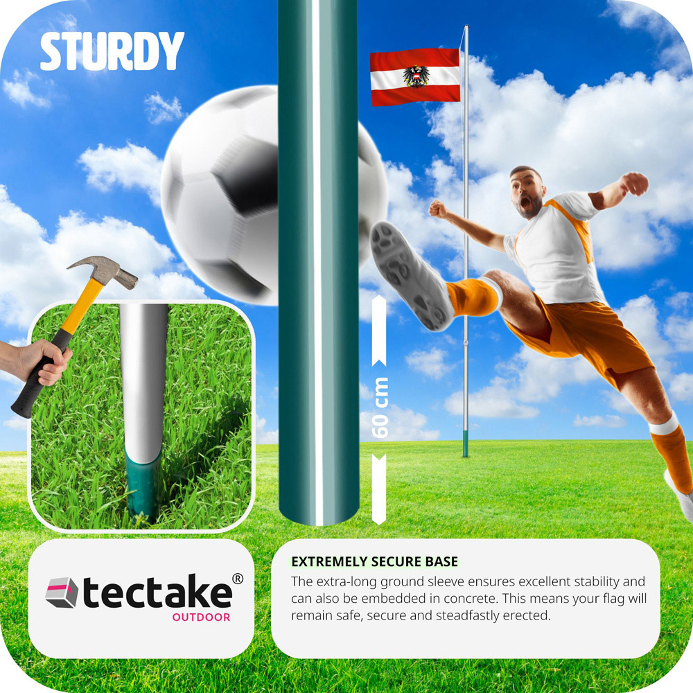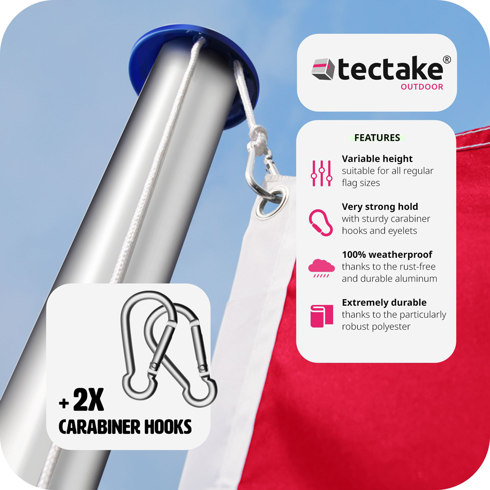 This aluminium flagpole from tectake, is the perfect addition for displaying your favourite banners and national flags. Crafted for durability, these ground mounted flagpoles are easy-to-install, adjustable, and simple-to use. The sturdy construction guarantees a secure display for your national flags, ceremonial bunting or custom business banner at home or work, and these poles promise easy installation. Upgrade your home's exterior with our Aluminium Flagpole for a touch of elegance and a perfect focal point for any occasion. The pole can be set to heights of 320cm, 470cm or 565cm and the included ground sleeve can be set in concrete to ensure a stable position. Thanks to the included rope, you can raise your flag or banner in seconds. Your choice of flag included with each purchase.