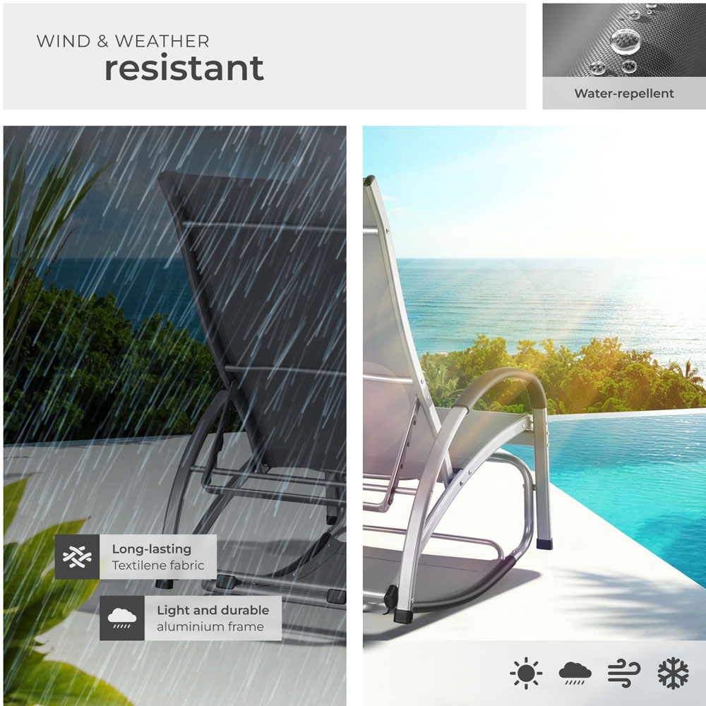 Discover the Avignon Sun Lounger from tectake, the perfect blend of comfort and functionality for your garden or outdoor space. Whether you're lounging in the sun or gently rocking in the shade, this versatile lounger features an innovative two-in-one function, allowing you to use it as both a garden lounger and a comfortable rocking chair. With a grey and black colour scheme, this stylish furniture piece boasts a flexible backrest that can be adjusted to four angles for maximum comfort. The ergonomic design perfectly adapts to your body, offering support for hours of relaxation. Ideal for the terrace, balcony, or your next camping trip, the Avignon Lounger combines practicality with elegance. Constructed from a durable powder-coated aluminium frame, this lounger provides exceptional stability and load-bearing capacity. The breathable, water-repellent Textilene fabric ensures that your furniture stays dry and comfortable. The non-slip plastic feet provide added stability on any surface. Elevate your outdoor space with the Avignon Sun Lounger, the perfect addition to your home. Enjoy summer in style with this rattan lounger that combines the best of design and comfort. Shop now and make it your new favourite spot!