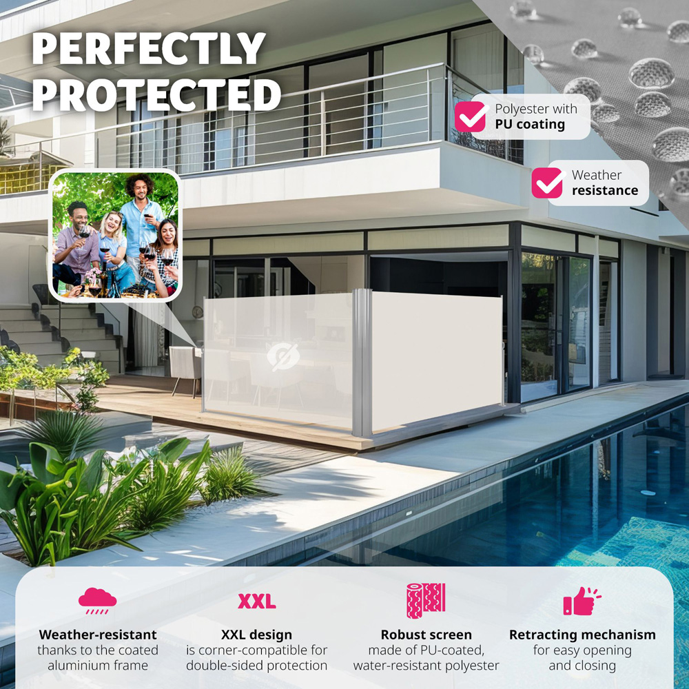 This beautiful aluminium double-side awning from tectake offers perfect protection for your outdoor privacy as well as against wind. Celebrate with your guests undisturbed in the garden, on the terrace or on the balcony. By means of the automatic winding mechanism, the side awning is quickly spread out. The robust, weatherproof polyester fabric of the balcony privacy screen is very durable and is equipped with built-in UV protection. The side awning can span up to 6m. After use, the awning is rolled back up into the aluminium case using the built-in tension spring mechanism. It is set up in just a few steps. Screws and dowels are included in the delivery.