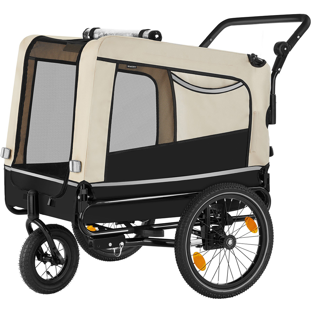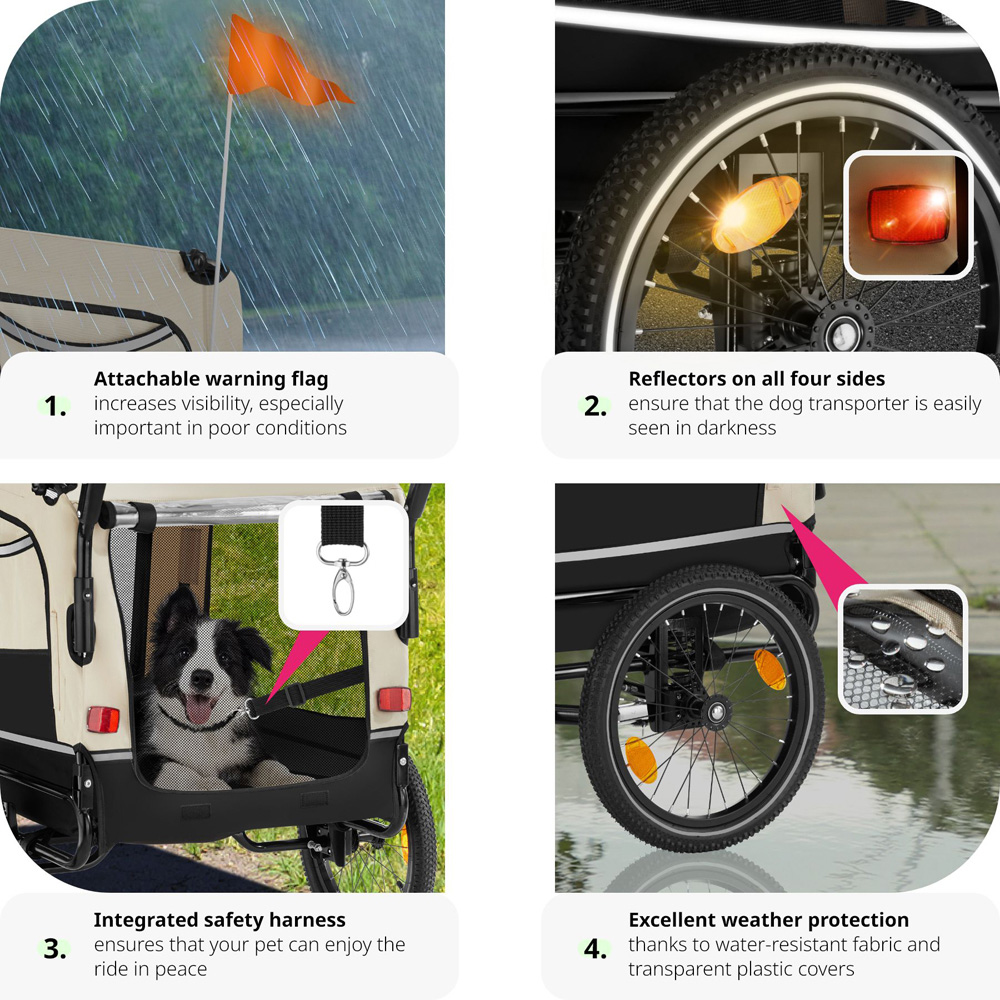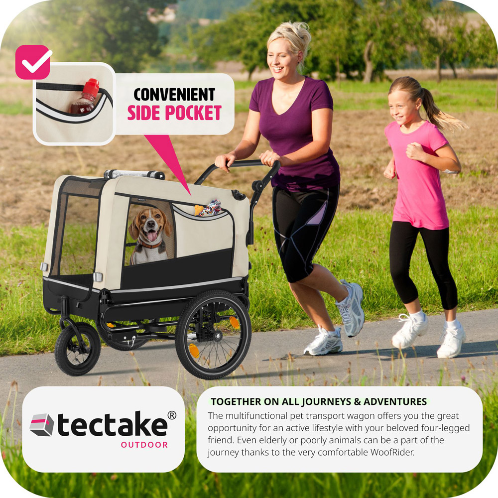 Give your pet new impressions and experiences every day with exciting excursions in the comfortable dog bike trailer from tectake. Thanks to the bike trailer's foldable hitch bar, the quickly mounted front wheel and the attachable push handle, it is quick and easy to transform the bike trailer into a stroller jogger. The transport carrier features air-permeable mesh inserts which ensure plenty of airflow, while the non-slip bottom gives your four-legged companion safety and comfort. Safety is further enhanced thanks to the robust frame whilst visibility in road traffic is guaranteed thanks to various light strips and reflectors as well as an attachable warning flag. Large dogs will have plenty of space and feel right at home thanks to the generous interior size, whilst pets will be kept protected from the rain thanks to the protective rain cover. With this dog bicycle trailer with wheels from tectake, you are perfectly equipped for large and small tours with your pet.