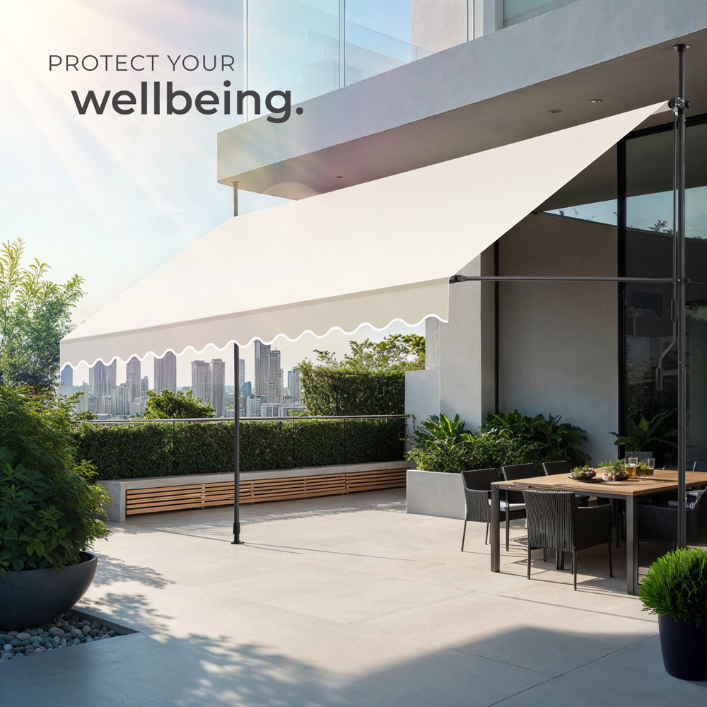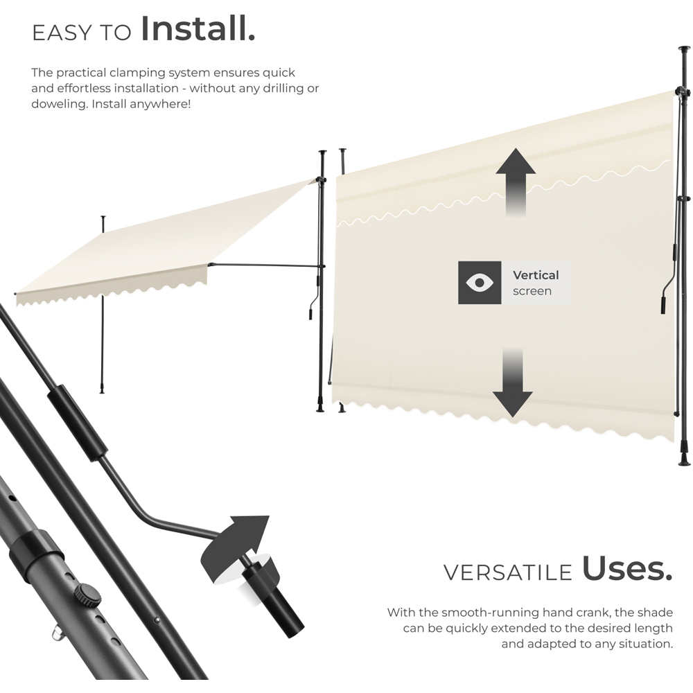 This manual awning provides protection from the sun and rain, making your patio, garden, or outdoor area more useful whatever the weather. Key features include a smooth-running hand crank, and UV and rain resistance. Plus, as it is constructed from powder-coated steel, aluminium, and polyester fabric, it is built to last. Compared with other awnings and similar products, installation of this home awning is done using a simple clamp system and requires no drilling into exterior walls. Enjoy the flexibility of a retractable patio canopy, which allows you to effortlessly bask in the sun's warmth or take shelter in the cool shade. Enhance your outdoor space with the retractable awning from tectake, perfect for a patio door, window, or as a roof extension. This easy-to-install awning requires no drilling and provides excellent sun protection with its durable fabric canopy. Adjustable for the ideal shade, it is perfect for windows or roofs or to add style and practicality to your outdoor area. Shop now for a versatile awning that brings comfort and protection.