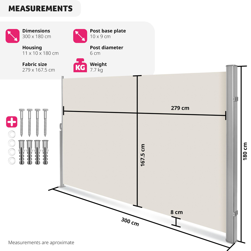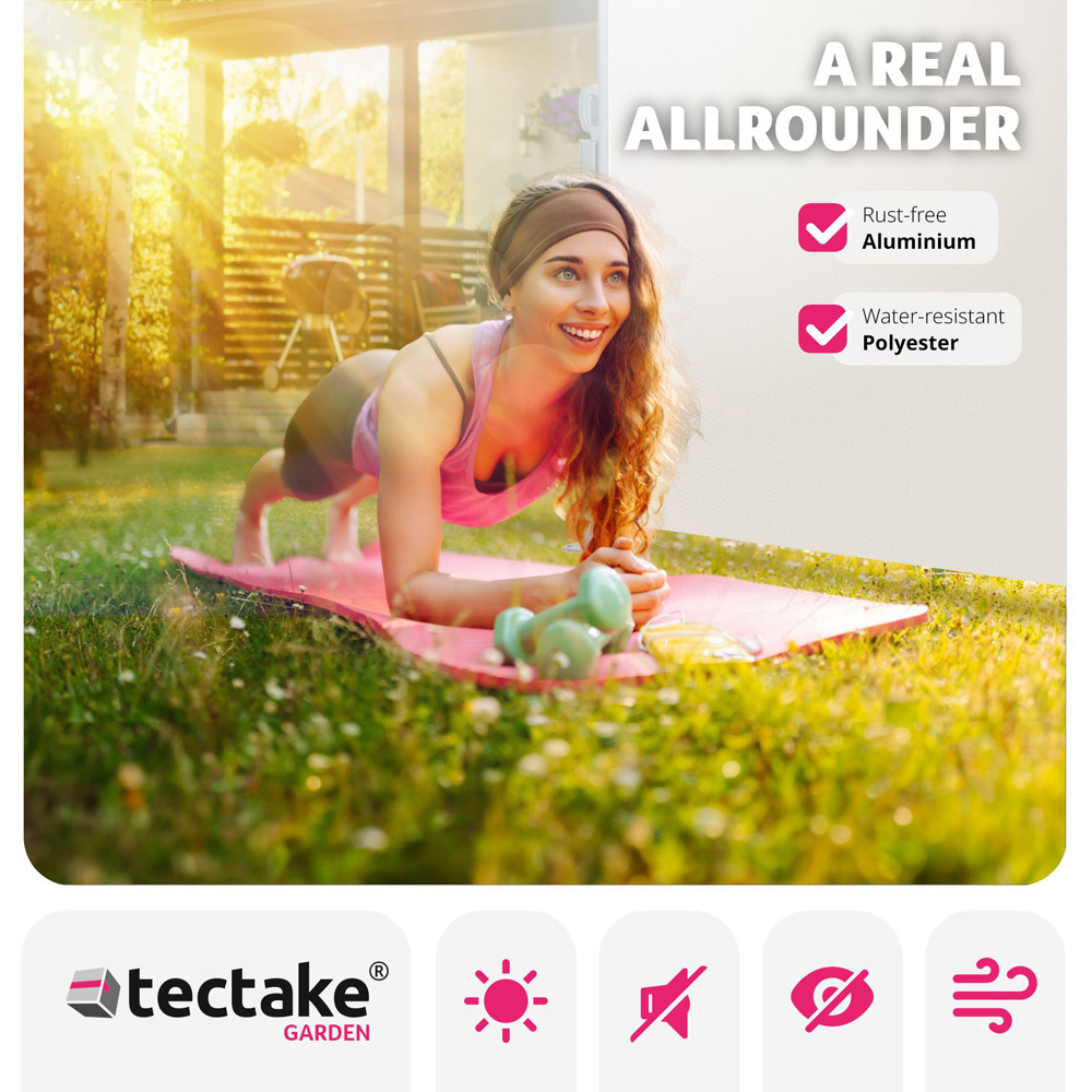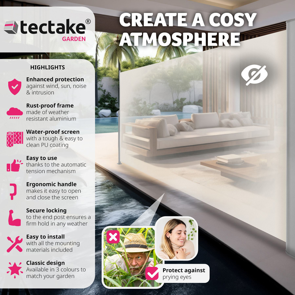 Transform your outdoor space into a sanctuary of privacy and tranquillity with the retractable side awning. This robust side awning is designed to shield you from prying eyes, low-lying sun, and gusty winds, making it a must-have accessory for any garden or patio setup. Crafted from high-quality, water-repellent polyester and a rust-proof aluminium frame, this side canopy is built to last, ensuring long-term durability and reliable performance. Ease of use is one of the standout features of the side awning. The automatic roll-up mechanism allows for effortless extension and retraction. Simply pull the screen out using the convenient handle and lock it into the supporting post. When done, the tension spring mechanism ensures a smooth and hassle-free retraction, allowing more time to relax and enjoy the outdoor space. Whether looking to create a shaded seating area or needing a wind barrier for the patio, this retractable side awning offers excellent protection against sun and wind, allowing enjoyment of the garden in peace. The aluminium casing protects the awning fabric from dust and dirt, further extending its lifespan. For a stress-free setup, the garden privacy screen comes with all necessary assembly materials, including screws, wall plugs, and washers for both the housing and the post. With the help of a power drill or a wrench, the installation process is quick and straightforward, ensuring that the side awning remains stable and secure, capable of withstanding various outdoor elements. Its sleek and modern design blends seamlessly with any garden decor, offering both practicality and style. This versatile product is the perfect solution for those looking to enhance their outdoor living experience, providing shade, privacy, and protection in one comprehensive package. Take the first step toward a more comfortable and private outdoor living space.