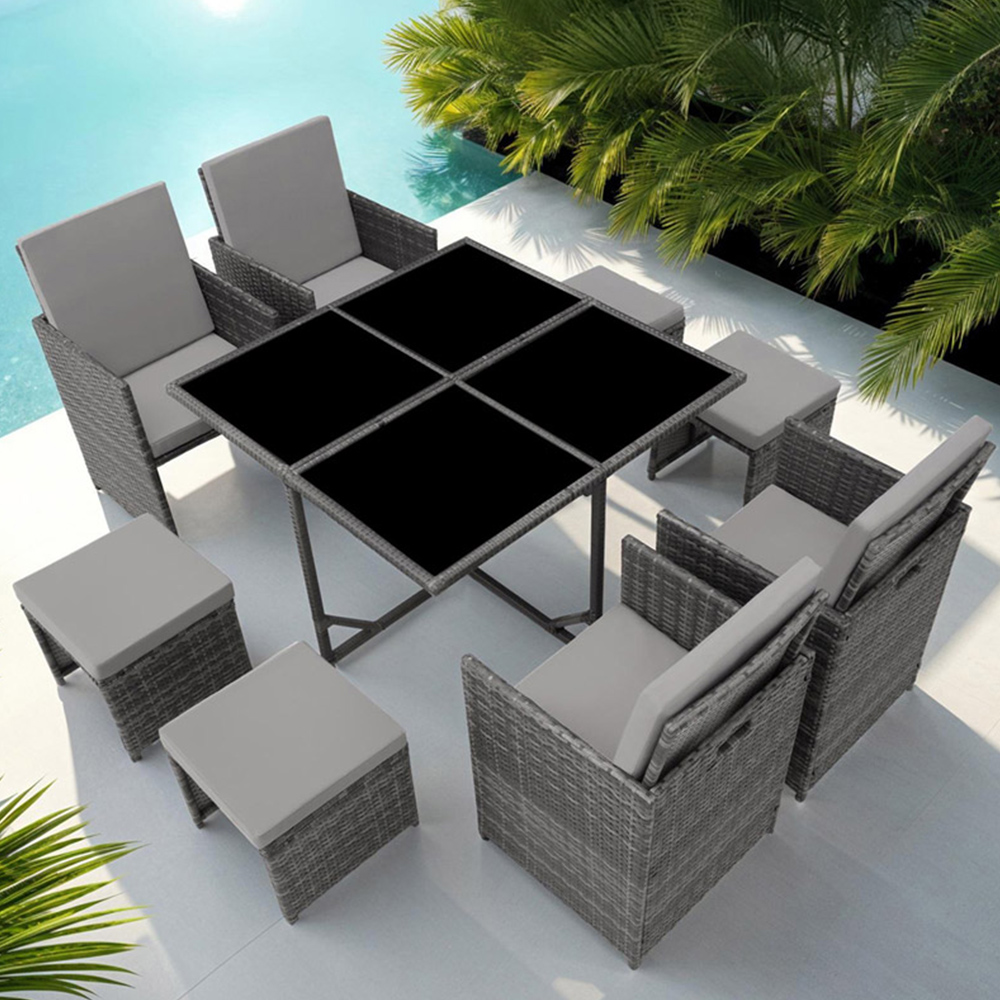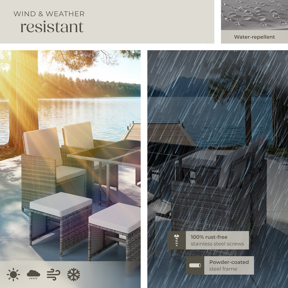 Transform your outdoor living space with the Garden Table and Chairs Bilbao, an exquisite rattan dining set designed for comfort, durability, and style. This garden furniture set is perfect for those who want to infuse a touch of Mediterranean elegance into their outdoor space without sacrificing functionality. Garden Furniture Set with Practical Protection Experience the convenience and elegance of the Garden Table and Chairs Bilbao. This rattan garden furniture set includes a protective cover, ensuring your investment remains pristine year-round. The set features four rattan dining chairs with seat and back cushions, four stools with cushions, and a table topped with four dark-tinted safety glass panels. Designed to accommodate up to eight people, this set offers versatile seating arrangements for family gatherings or intimate dinners. When not in use, the chairs can be neatly slid under the table, creating a compact and organized layout. Robust and Stylish Rattan Dining Chairs The rattan dining chairs in this garden table and chairs set are not only aesthetically pleasing but also incredibly practical. Each chair includes water-repellent, removable covers that make maintenance a breeze. The chairs' retractable backrests allow for easy storage under the table, maintaining a tidy garden or patio area. Additionally, the grips on the back make handling effortless, adding another layer of convenience to this already impressive dining set. Dining Table with Resilient Safety Glass At the heart of this garden furniture set is a sturdy table featuring four separate dark-tinted safety glass panels. Measuring approximately 110 x 110 x 73 cm, this table is perfect for both casual breakfasts and sophisticated dinners. The robust glass surface not only adds an element of elegance but also provides outstanding stability, making it a central piece in your outdoor dining experience. Comfortable and Weather-Resistant Design Enjoy ultimate comfort with the Garden Table and Chairs Bilbao, which includes plush seat and back cushions for each chair. The polyester covers are water-repellent and easily removable for hand cleaning, ensuring your furniture remains in top condition. The set€™s UV-resistant rattan construction guarantees longevity and resilience against various weather conditions, making it an ideal choice for outdoor use. Making the Most of Your Outdoor Space The Garden Table and Chairs Bilbao set is a versatile and stylish addition to any outdoor space. Its multi-use design allows the four stools to be used as footrests, providing additional comfort options. When it's time for storage, use the included protective cover to shield the set from the elements, keeping it clean and protected whether on the patio, in the garage, or in storage for the winter. Add the Garden Table and Chairs Bilbao to your home and transform your garden into a Mediterranean retreat. Shop now to take advantage of our latest sale and bring this elegant, practical, and durable garden furniture set to your outdoor living area.