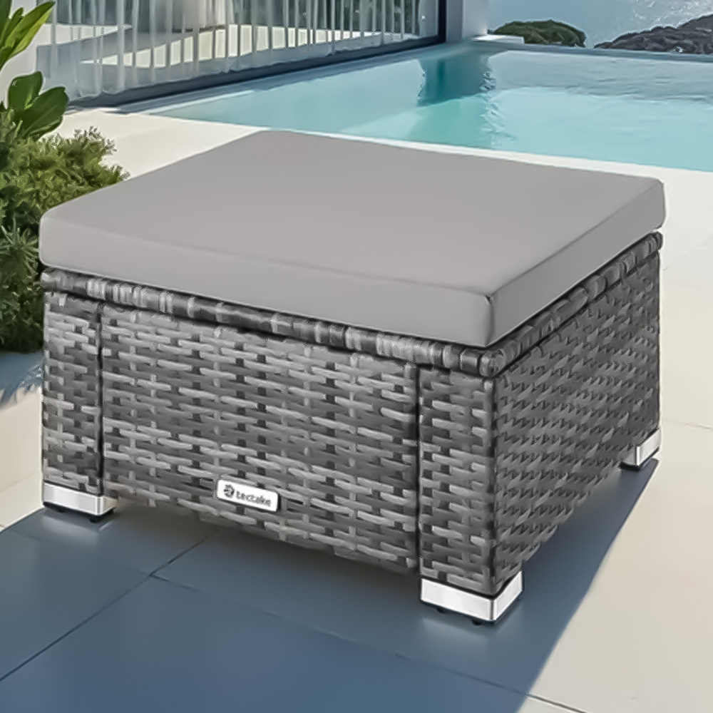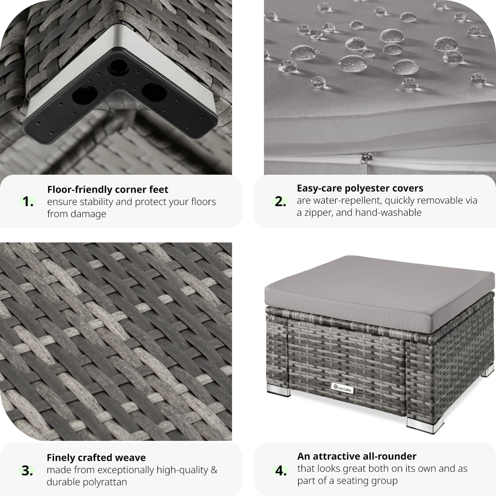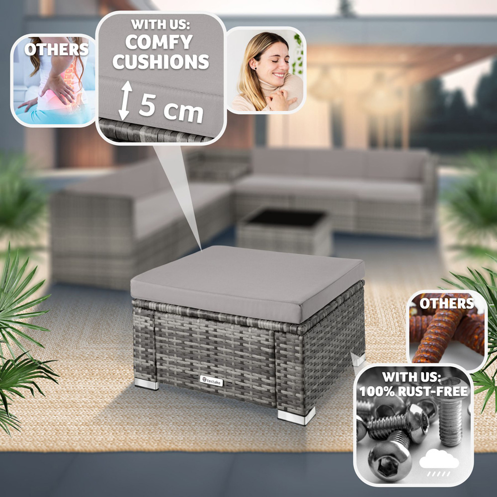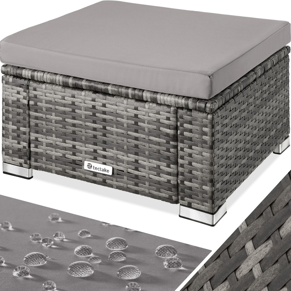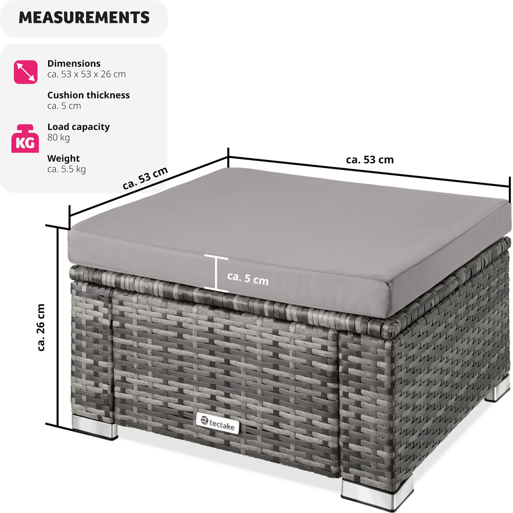 Square, practical, beautiful; this rattan footstool from tectake is sure to turn heads in your outdoor space, on its own or as part of an existing rattan garden furniture set. The low-maintenance construction made from stainless steel screws and poly rattan can withstand wind, sun and rain. The large, thick cushion complements the footstool perfectly. To protect the padding from water, the surface is impregnated. Thanks to its height, this stable foot stool is ideal for setting down drinks, books and similar. Treat yourself to a time-out as you put your feet up at home on this comfortable rattan footstool from tectake. Dimensions: 53 x 53 x 26cm.