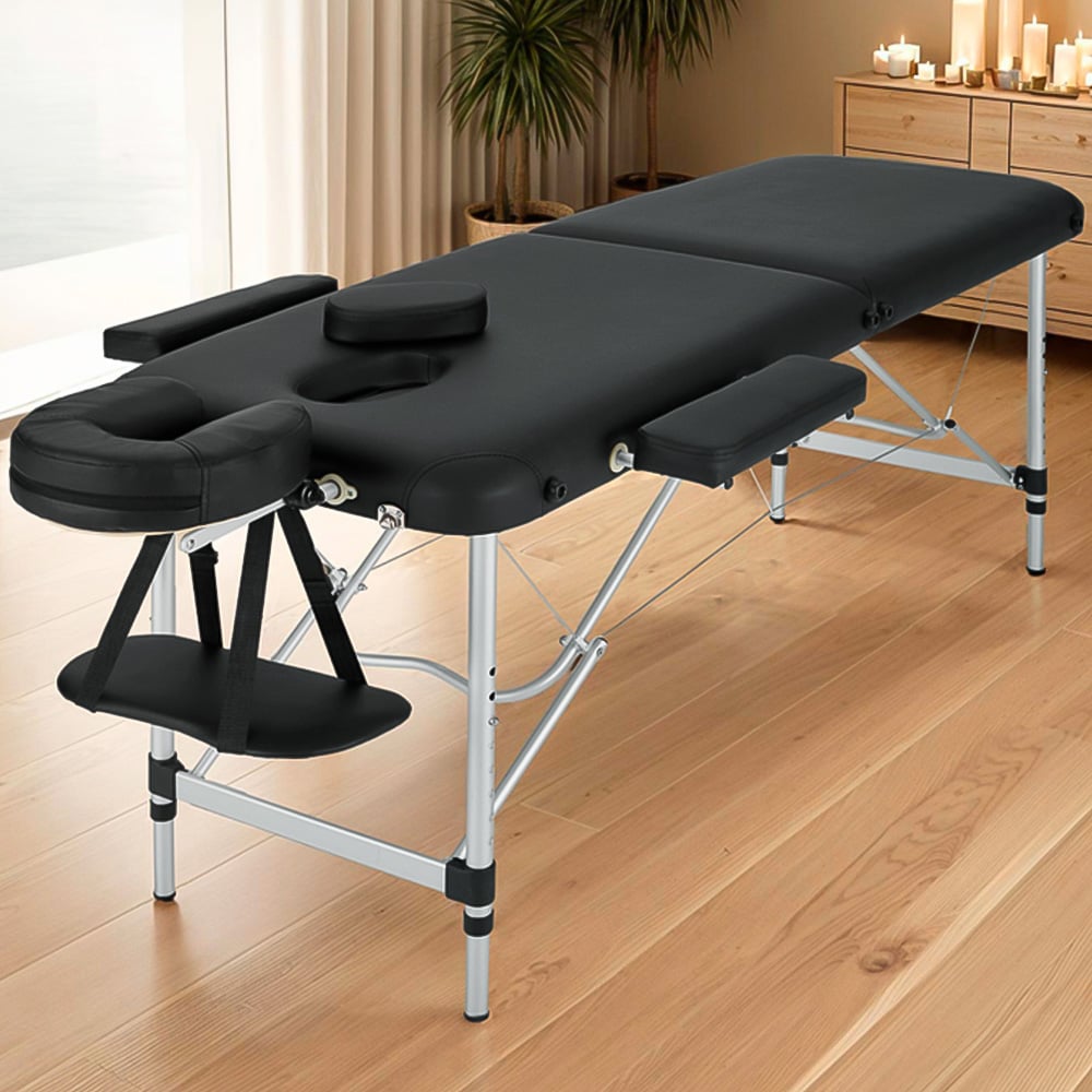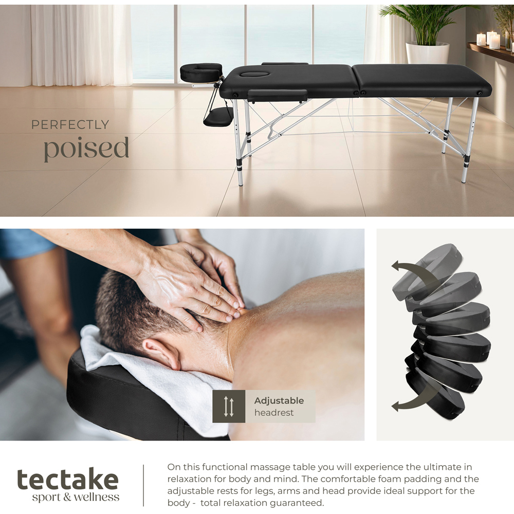 Experience the ultimate relaxation with the Tectake Black 2 Zone Massage Table with Carry Bag and Armrest. This portable massage table is crafted to deliver unparalleled comfort and convenience, perfect for creating a peaceful corner in your home. Featuring an aluminium-plastic headrest and oil-and water-resistant vinyl cover, it ensures a stress-free, hygienic experience every time. With height adjustments ranging from 63 to 89 centimetres, the table adapts effortlessly to your needs, providing a comfortable experience for both the masseuse and the person being massaged. The soft foam padding, covered in durable vinyl, is resistant to oil and water, ensuring longevity and easy maintenance. The removable headrest and detachable armrests offer optimal positioning, while the face cushion can be removed for easy cleaning. The table's compact design allows for easy folding and storage, with legs and individual parts conveniently attached to the bottom and secured with a holding strap. The included carrying case makes transport simple, enabling you to take your massage experience wherever you go.