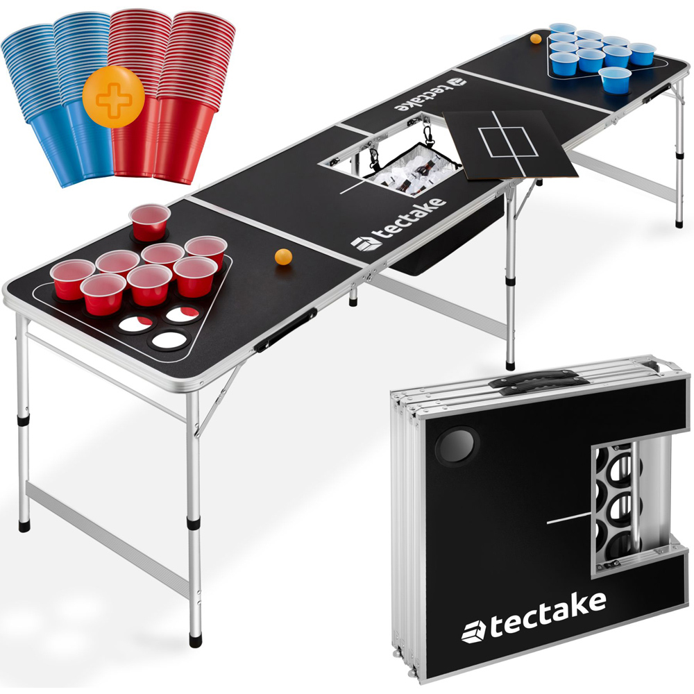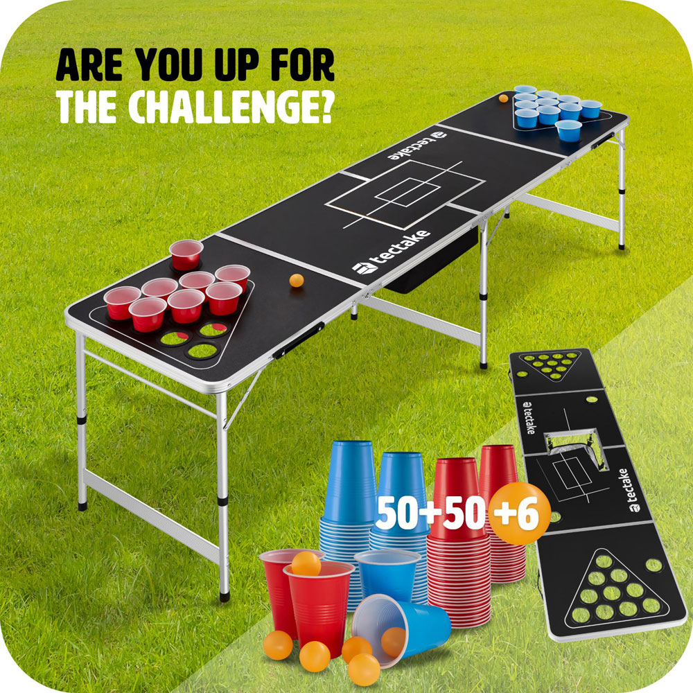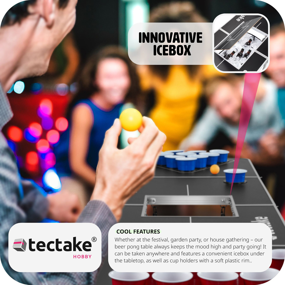 Introducing the beer pong table 'Blitz' - the ultimate game-changer for your parties and gatherings. This stylish beer pong table is not just another ordinary table; it comes packed with features designed to elevate your beer pong game to the next level. Whether you're a seasoned player or a newbie, the 'Blitz' model promises an unparalleled beer pong experience. The main highlight of the beer pong table 'Blitz' is its innovative ice compartment, ensuring your drinks stay cold throughout the game. No more running back and forth to the fridge; your beverages are conveniently kept within arm's reach. This feature alone sets the 'Blitz' apart from conventional beer pong tables and makes it a must-have for any serious beer pong enthusiast. The beer pong table 'Blitz' is constructed with a durable, printed, and coated MDF playing surface that stands up to the most intense games. The soft plastic edges around the cup holes add an extra layer of protection for your cups, preventing unnecessary spills and messes. The frame is made of lightweight, rust-resistant aluminium, making it both sturdy and easy to transport. Thanks to its folding design and practical carrying handles, you can take the 'Blitz' beer pong table anywhere, from your backyard to your friend's place. One of the standout features of the 'Blitz' model is its double height-adjustable legs, complete with cross braces for added stability. This means you can set the table at the perfect height for your playing preference, ensuring that every game is comfortable and enjoyable. Additionally, the table is equipped with floor-friendly plastic feet to protect your indoor surfaces. The beer pong table 'Blitz' doesn't just stop at being a superior table; it comes as a full set. Included are 100 cups and 6 balls, so you're ready to start the game right out of the box. This complete beer pong set makes the 'Blitz' the ideal choice for anyone looking to host unforgettable parties and events. Ready to elevate your beer pong game? The beer pong table 'Blitz' is your perfect companion. Order now and be the star of your next gathering with this stylish, functional, and highly portable beer pong table.