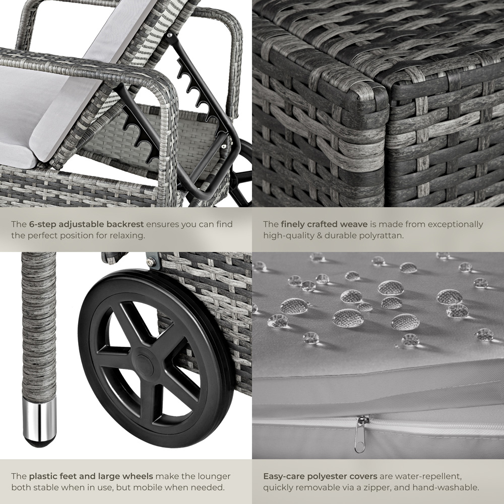 Elevate your relaxation with the premium Sun Lounger, designed to transform any space into a luxurious retreat. Whether it's in your garden, beside the pool, on the terrace, or inside a conservatory, this exquisite sun lounger provides unmatched comfort and elegance. The thoughtfully crafted design ensures a perfect blend of functionality and style. This Sun Lounger is designed to meet all your comfort needs. With a six-position adjustable backrest, you can effortlessly switch from an upright seated position to a completely flat lying position, making it an ideal choice for those who value versatility. The additional cushioned headrest can be adjusted or removed based on your preference, ensuring personalised comfort. Constructed from high-quality, rattan-like synthetic weave, this garden recliner chair is both durable and stylish. The UV-resistant and weatherproof materials guarantee long-lasting beauty, while the powder-coated steel frame provides a sturdy and stable foundation. With rubberized wheels, the lounger is incredibly easy to move, adding to its convenience. Enjoy the luxury of hassle-free maintenance with our sun lounger. The included cushion is not only comfortable but also water-resistant. Thanks to its practical zipper, the cushion cover can be easily removed for washing, ensuring that your recliner remains fresh and inviting, no matter how often you use it. Perfect for transforming any outdoor area into a stylish and comfortable oasis, this lounger is a fantastic addition to your outdoor furniture collection. With generous dimensions of 200 x 70 x 33 cm, it offers ample space for you to unwind and enjoy the beauty of your surroundings. Whether you place it in your home garden, by the pool, or on the terrace, this versatile sun lounger provides the perfect spot for relaxation. Its high-quality construction and thoughtful design make it a must-have for anyone looking to create a serene outdoor retreat.
