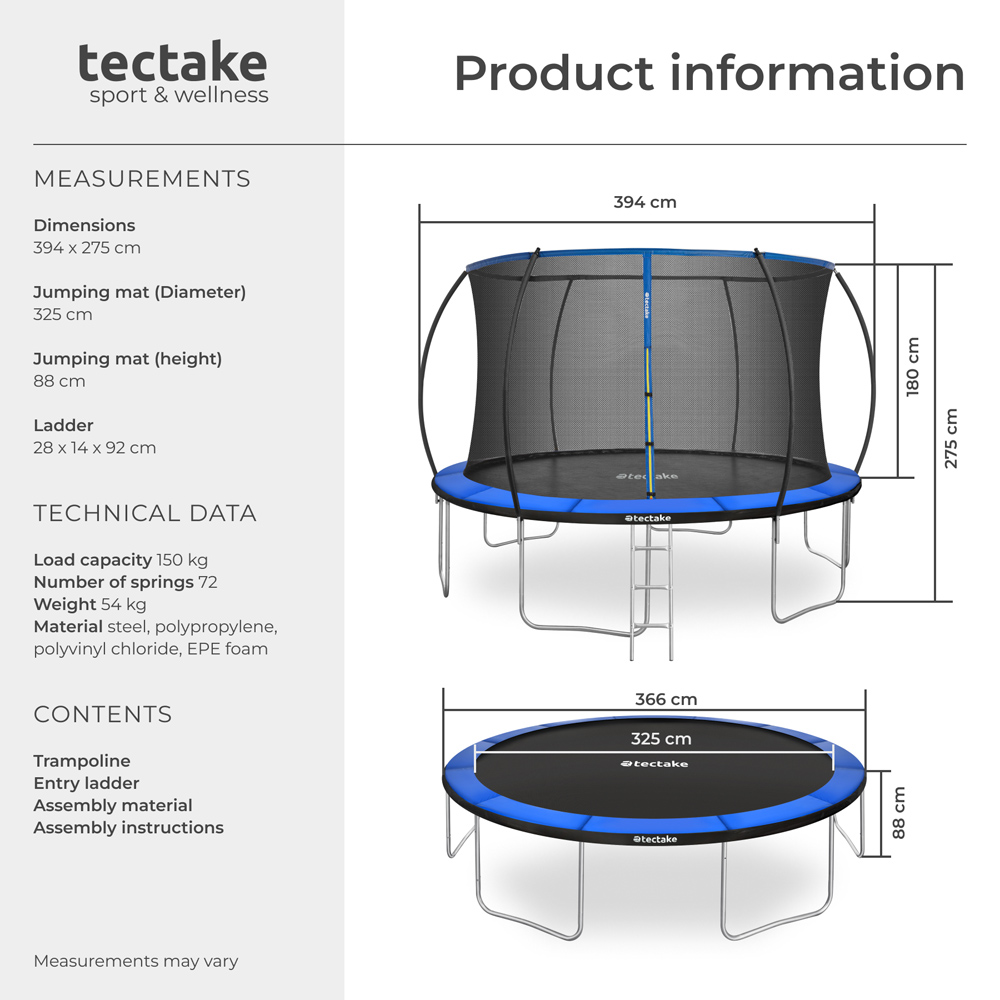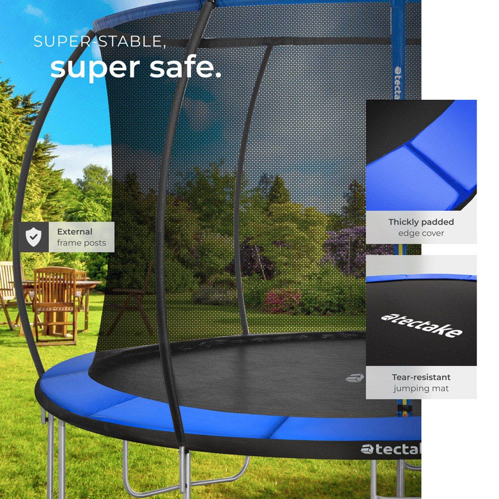 The trampoline 'Jumpy' from tectake offers your children unlimited playtime fun in the garden. Equipped with an elastic and robust safety net, it provides 100% all-around protection and unclouded joy while jumping plus the posts & edges are generously padded to effectively prevent injuries. These trampolines are not just a piece of sports equipment, but a guarantee for unforgettable outdoor experiences. Discover the best trampolines for endless play and fun in your backyard! Whether you're looking for an 8ft, 10ft, or 12ft trampoline, our shop has the perfect size trampoline for your family. Designed with safety in mind, each trampoline features a secure enclosure to keep your kids safe while they jump and bounce. Plus, enjoy free accessories with every purchase, making it the ultimate package for active outdoor fun. Upgrade your garden with the perfect trampoline today!