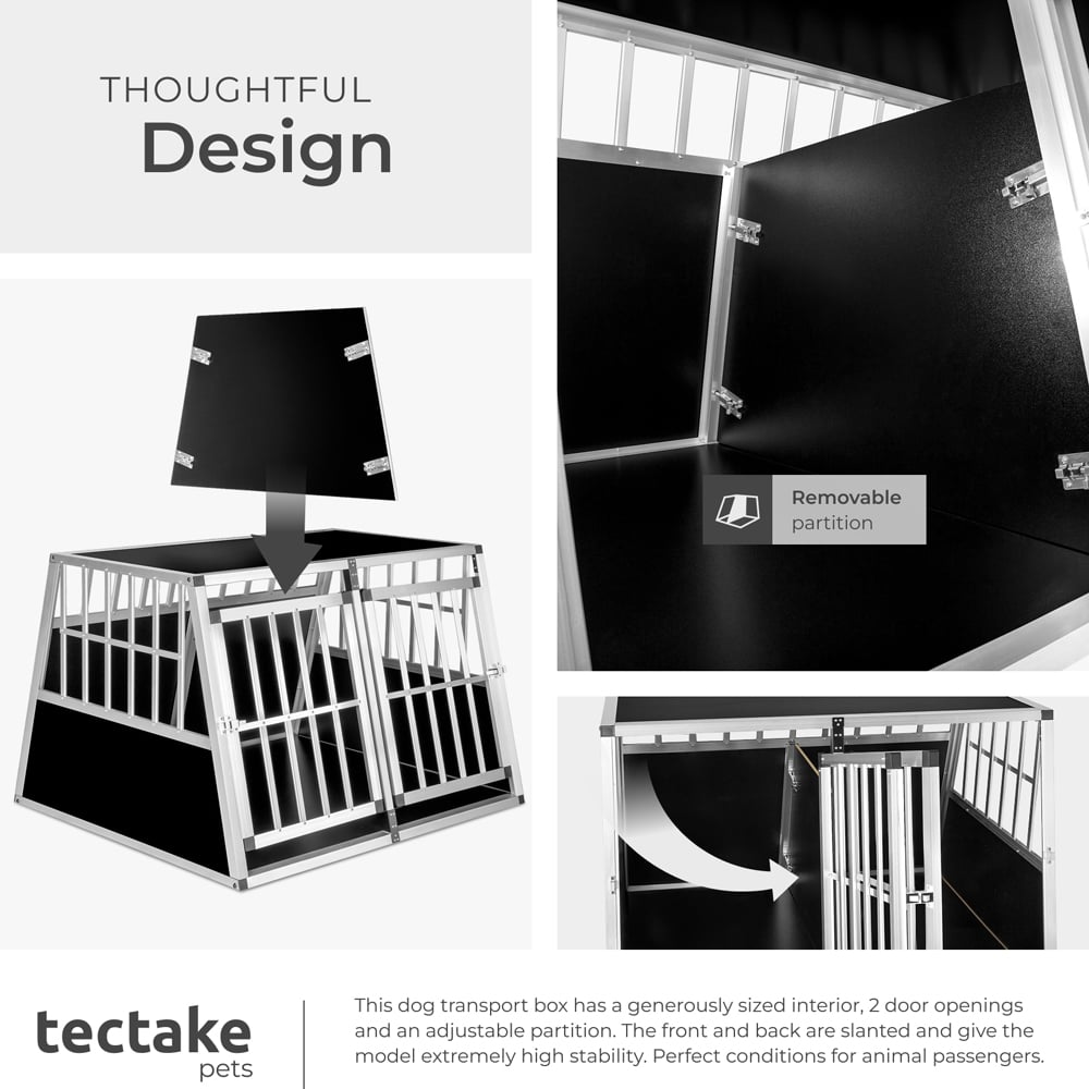 When it comes to ensuring your dog's safety and comfort during travel, this Dog Crate Double is your perfect companion. Whether you're taking a trip to the vet, going on vacation, or simply heading to the park, this travel crate provides a secure and welcoming resting place for your pet. Crafted from robust and easy-to-clean aluminium, this dog crate is designed to withstand the rigours of travel while providing a worry-free environment for your furry friend. This dog car crate is engineered for convenience and safety. The simple assembly process means you can set it up in no time, and the protective plastic corners reduce the risk of injury, making it a great choice for pet owners who prioritise their dog's well-being. The crate's dimensions (104 x 90.5 x 69 cm) make it suitable for various car models, fitting comfortably behind the front seats or in the trunk when the back seats are folded down. The slanted front and back walls contribute to its trapezoidal shape, optimising it for car travel and ensuring a snug fit. Designed with your dog's comfort in mind, this dog cage features long grid bars on the sides and front, ensuring excellent airflow and visibility. This design helps to prevent your dog from feeling confined or stressed by providing a well-ventilated space with a clear view of their surroundings. This makes the crate ideal not just for travel but also for training and creating a secure spot for your pet at home. The generous interior space of this dog car carrier allows your pet to move around comfortably. The crate is equipped with a secure lock on the grid door, ensuring that your dog remains safely inside while travelling. The spacious design also allows for the inclusion of your dog's favourite toys and small bedding, making the journey more pleasant. Made from durable aluminium, this dog crate is built to last, ensuring long-term use. The crate's easy-to-clean surface means you can maintain hygiene without much effort. Whether you are travelling for short trips or extended vacations, this transport crate is a reliable choice for pet owners looking for a dependable travel solution. Invest in a high-quality travel accessory with this Dog Crate Double and provide your dog with a secure, comfortable, and spacious environment, no matter where your adventures take you.