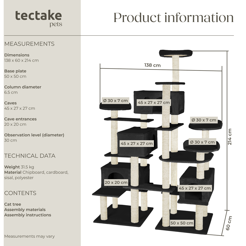 Adventurers, climbers or loungers: with this versatile cat tree from tectake, no matter your cat's wishes, they will all come true. Your cat can play and explore across several levels, structured to form an optimal activity centre. The numerous sisal pillars are ideal for scratching. The four platforms are perfect for your cat to chill and lounge on, with the utmost platform set at over 2 metres, perfect for your cat to survey their kingdom and satisfy their natural curiosity. Four cat caves give your cat plenty of places to cuddle up and rest in safety and comfort. Due to the size and extensiveness of the cat tree, it is perfect for multiple cats or just to treat one particularly special pet! The two bases give the cat tree extra stability - even if playtime gets boisterous. Give your cats or kittens a treat and get them this cat tree from tectake. Give your pet the ultimate playground with a large cat tree designed for endless fun and relaxation. Featuring multiple scratching posts, cosy beds, and engaging toys, this cat tree is perfect for keeping your cat active and entertained. Available in stylish colourways that have grey, beige, or cream elements, it blends seamlessly into any home decor. With elevated platforms offering a perfect view, your furry friend will love their new favourite spot. Ideal for pets of all sizes, these trees provide the perfect combination of comfort and play.