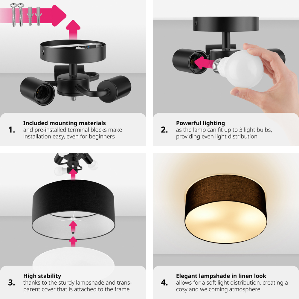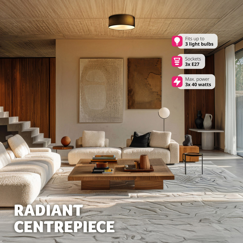 Experience the seamless blend of elegance and practicality with the Circum ceiling light, featuring a textile lampshade in a sophisticated linen look and a robust steel frame. This ceiling light not only enhances the aesthetic appeal of any space but also offers optimal functionality. Whether you're aiming to create a warm, inviting atmosphere in your living room or add a tasteful focal point in your hallway, this lamp's timeless design ensures it complements both modern and classic interiors. Its durable construction and the ability to house up to three bulbs allow for customisable brightness to suit your needs, making it a perfect choice for various settings.