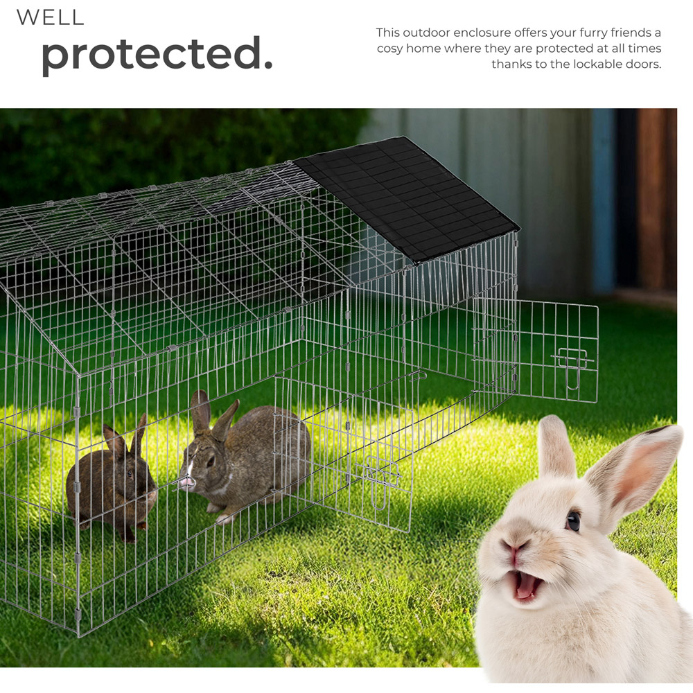 This rabbit run hutch with sunshade from tectake will give your small pet a safe and cosy place to enjoy the great outdoors. This rabbit run is perfect for your garden as it is enclosed from above and the sides, to help deter predators such as cats, foxes and birds of prey. The ground is completely exposed, meaning that your rabbits can happily graze on the fresh grass. The rabbit run cage makes sure your pet gets some fresh air thanks to the grated elements. The high-quality grid provides stability thus protecting your pets and preventing any accidental escapes, whilst the convenient doors allow you to easily and safely access your rabbits at all times. The sunshade guarantees that your animals have a shady place to rest when the summer sun is high in the sky.