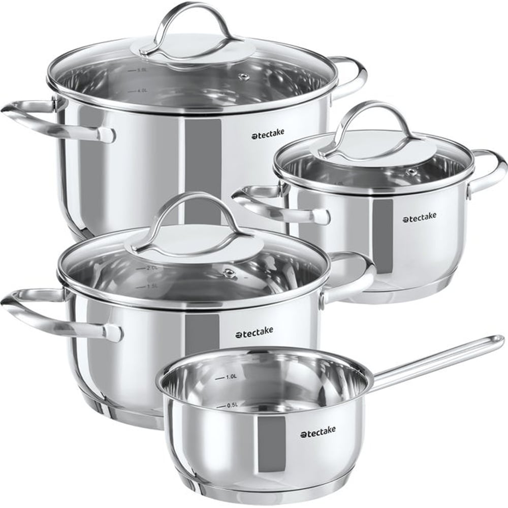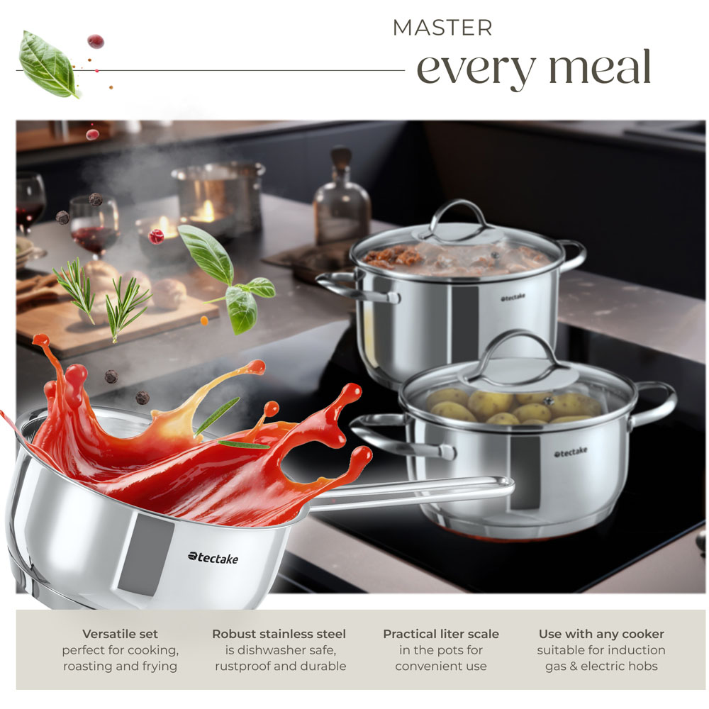 Elevate your culinary creations with the Bologna cookware set from Tectake, a versatile and high-quality addition to any kitchen. This comprehensive seven-piece set includes three differently sized stainless steel pots, each with a corresponding glass lid, and a practical saucepan, making it suitable for a variety of cooking needs. Designed for convenience, these saucepans are compatible with all stove types including induction, gas, and electric. The robust stainless steel construction ensures durability, scratch resistance, and rust-free maintenance, while the dishwasher-safe feature makes cleaning effortless. The heat-resistant handles provide a secure and comfortable grip, enhancing safety during use. A unique feature of this set is the internal litre measuring scale that allows for precise liquid measurements directly in the pot, reducing the need for additional measuring cups and simplifying your cooking process. The glass lids are not only stylish but functional, allowing for easy monitoring of your cooking while the steam vent efficiently releases pressure.