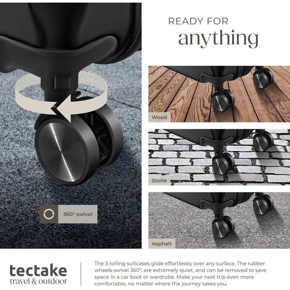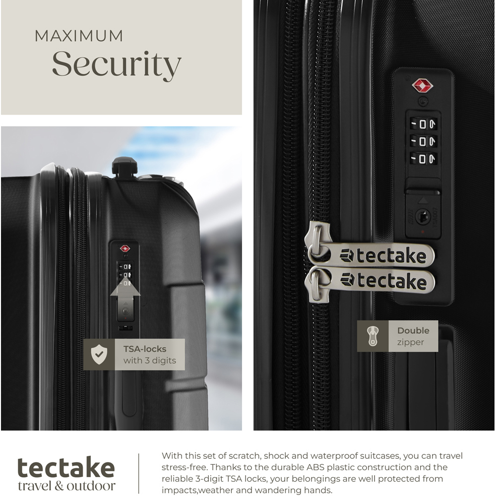 Discover the exclusive Brice suitcase set from Tectake, your reliable travel companion in three pieces. The lightweight and impact-resistant ABS hard shells promise maximum comfort and safety, allowing you to start your next cabin adventure stress-free. Each set is colour matched and black, champagne and rose gold are available. The cleverly designed luggage bags offer you everything you need in as lightweight hard shell suitcase. The integrated black straps and the divider with two additional compartments allow for interior division and keep everything in place. These large sets also offer a soft additional side pocket with a zip to neatly store small items. Equipped with an expansion fold, the suitcases can be expanded or compressed, letting you squeeze in to tight cabin bag restrictions. With these large hard shell luggage sets, you travel securely without compromise. Thanks to the three-digit TSA combination lock, your personal items are protected from unauthorised access, yet authorities have the option to open the suitcases with a master key during luggage inspections without having to destroy the lock – ideal for international travel and relaxed holiday starts. Each suitcase in the set features smooth-running, detachable black soft rubber wheels that can swivel 360°. They glide effortlessly over various surfaces, easing your journey. Plus the rubberised handles and the ergonomically shaped, triple-adjustable telescopic handle, offering maximum comfort With the Brice cabin bag set from Tectake, your new bags are perfect for your next trip.