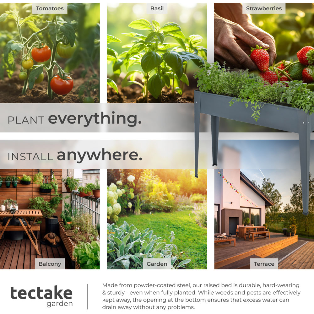 This versatile raised plant bed from tectake offers the best conditions for fragrant herbs, fresh vegetables or gloriously colourful flowers. The powder-coated steel construction is low-maintenance and stable. It also features floor-friendly plastic caps on its feet. Thanks to the practical drainage hole, excess water can easily escape, ensuring your plant roots are not damaged. The pleasant height of this planter ensures a comfortable position while gardening, saving your back. Perfect for the home outdoor garden to grow your plants.