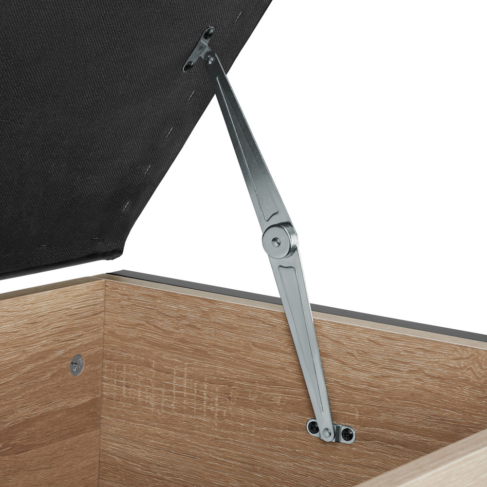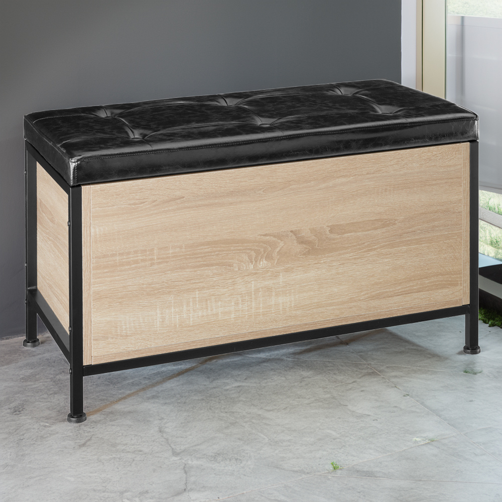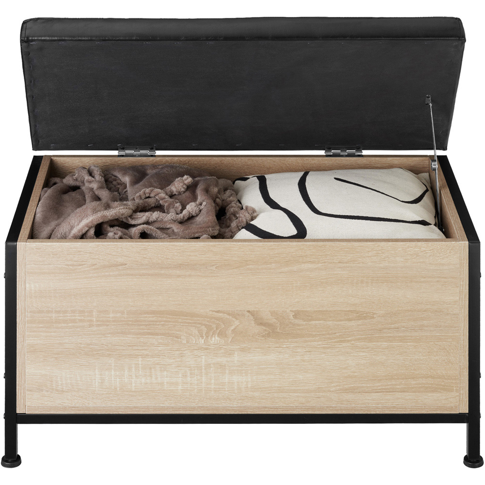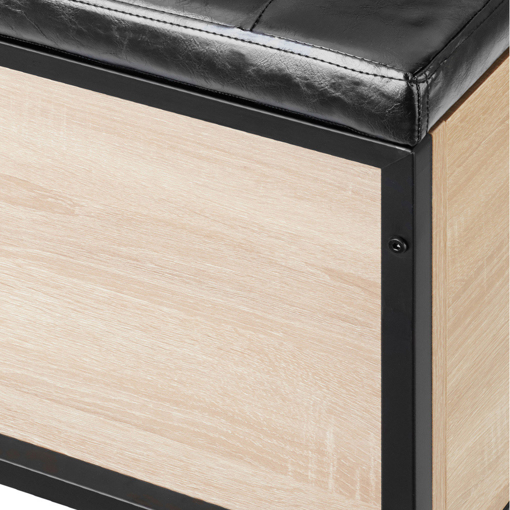 With the stylish padded storage bench Calico from tectake, you're bringing home a charming living room accessory with an industrial look. The bench's padded lid is adorned with a durable faux leather cover with fabric folds and buttons, which harmonises perfectly with the warm wood and cool steel. With the chests large interior storage space, the resilient seat is a multifunctional storage option for any entrance hallway, bedroom or living room. The compact construction rests on four feet that can be adjusted in height, thus guaranteeing the versatile piece of furniture a firm stand. The versatile and practical ottoman trunk can be used as to store your guest blanket or children's toys.