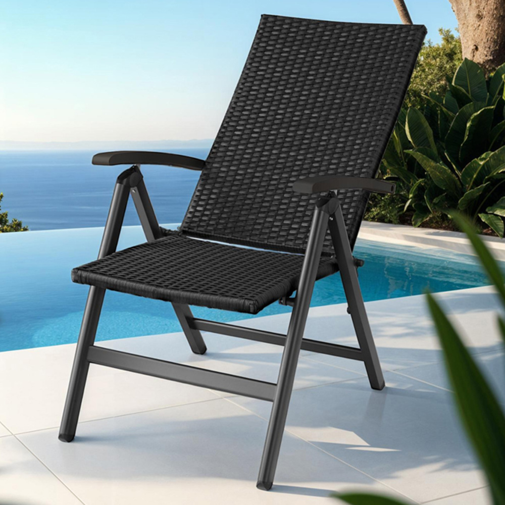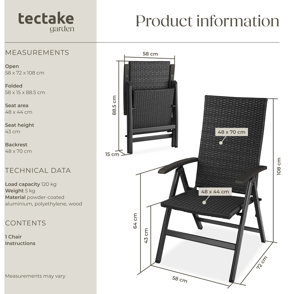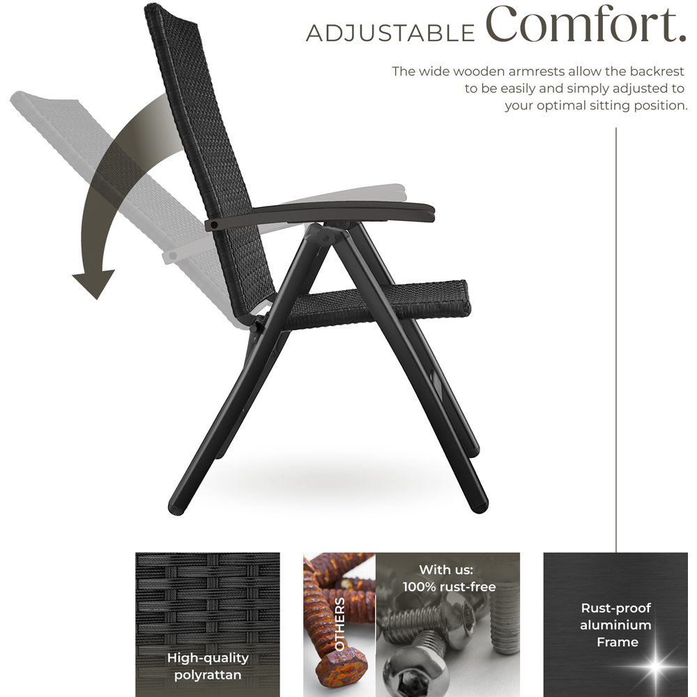 Experience ultimate relaxation with the six-fold reclining function of the Garden Chair Canberra. The backrest's angle can be effortlessly adjusted in six stages using the elegant hardwood armrests, allowing you to find the perfect reclining position. Whether you're basking in the sun or enjoying a quiet evening with a book, this garden chair provides the adaptability you need for any situation. Constructed with an intricate weave of UV-resistant Polyrattan, this chair guarantees long-lasting beauty and resilience against the elements. The Garden Chair Canberra features a robust yet lightweight aluminium frame, ensuring both stability and ease of movement. Additionally, the plastic garden chair components, including the feet with slip-resistant, floor-protecting plastic caps, contribute to its sturdy design. This ensures your chair remains steadfast on any surface while safeguarding delicate flooring. One of the standout features of this deck chair is its foldable design. The Garden Chair Canberra can be swiftly folded for effortless storage or transport, making it an ideal choice for those who need a versatile seating solution. Whether you're rearranging your outdoor space or taking your comfort on the go, this chair accommodates your needs with ease. Incorporate sophistication and functionality into your outdoor living area with the Garden Chair Canberra. By combining superior materials and thoughtful design, this garden chair not only enhances the aesthetic of your space but also offers practical benefits like easy maintenance and exceptional comfort. Designed to withstand all weather conditions, this chair ensures you enjoy the great outdoors year-round. Choose the Garden Chair Canberra for a blend of style, durability, and comfort perfect for any garden or patio setup. With its six-fold adjustable backrest, UV-resistant rattan material, and foldable design, it's the ideal addition to elevate your outdoor experience. Remember, for all your outdoor furniture needs, always trust quality garden chairs that stand the test of time.