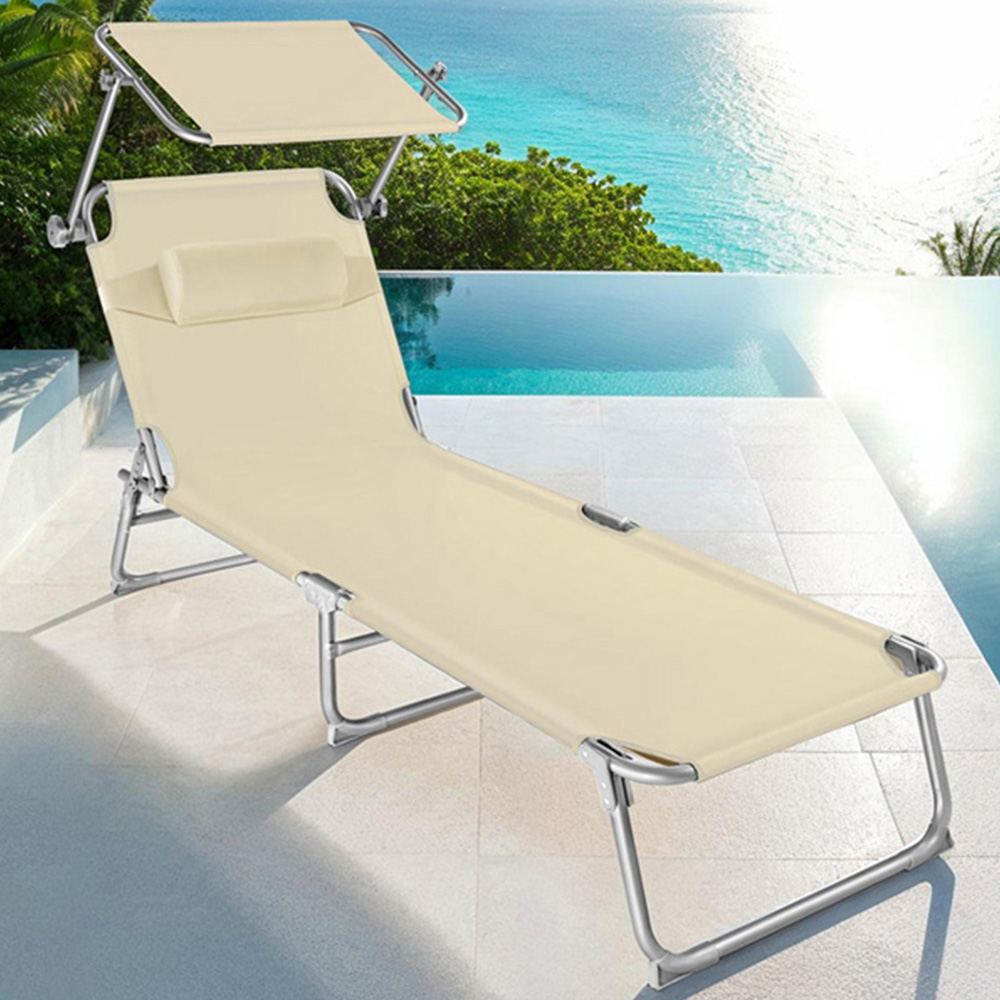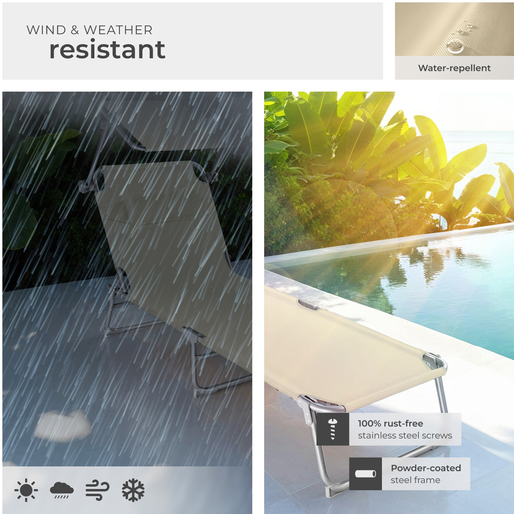 For maximum summer enjoyment, this versatile tectake Chloé Set of 2 Beige 4 Step Backrest Foldable Sun Lounger combines exceptional function with robust design. The four backrest settings, flexible sun shade, soft pillow and comfortable lounger body guarantees maximum relaxation. The powder-coated, three-legged steel base gives the easy-care construction extreme stability without the risk of tipping. The simple folding mechanism, ideal collapsed dimensions and practical carry handles make this lightweight garden sun lounger from tectake ideal for on the go.