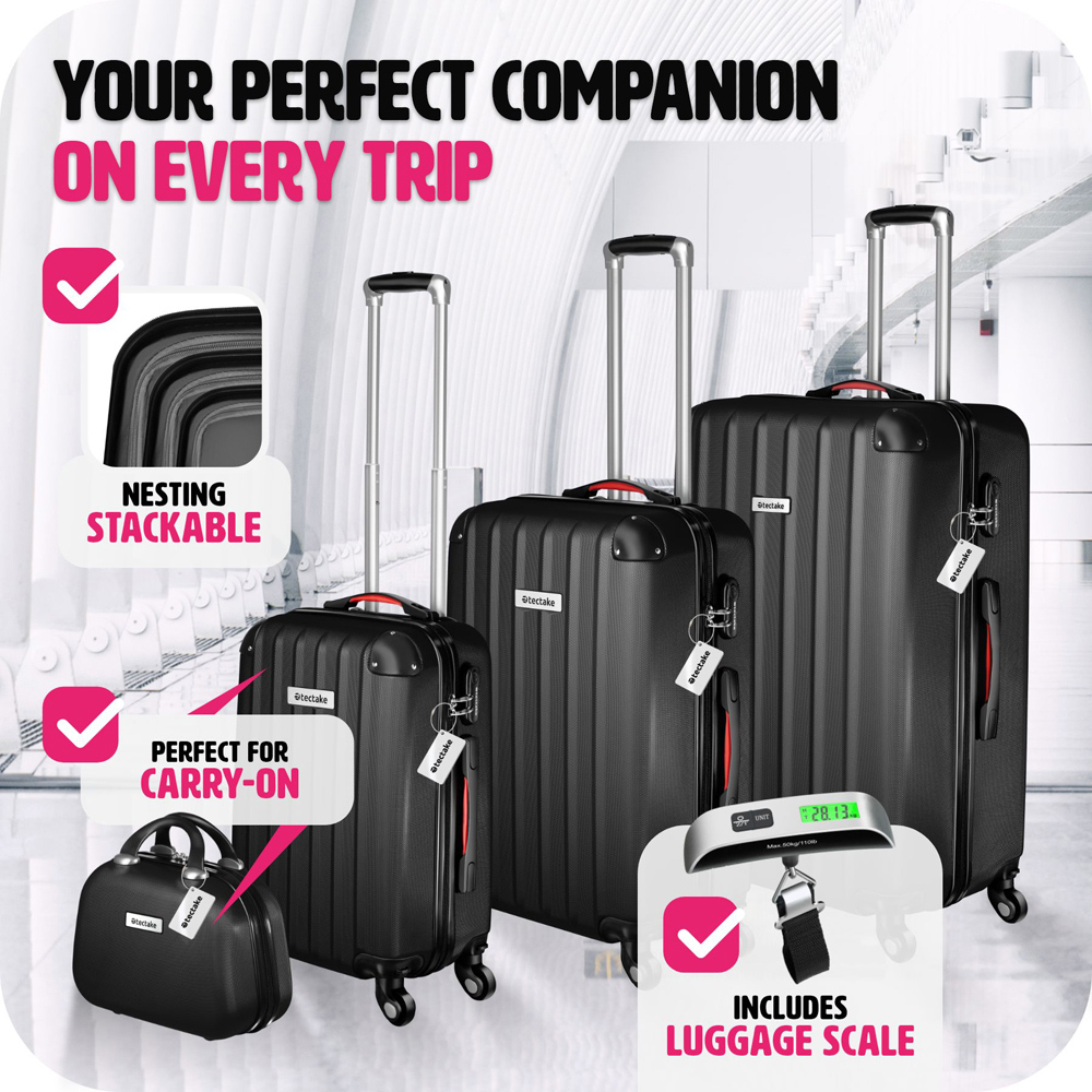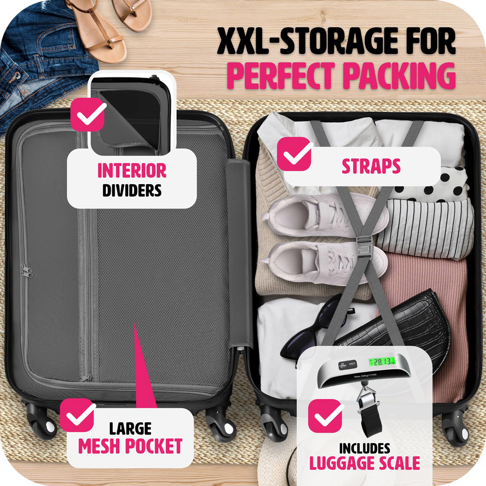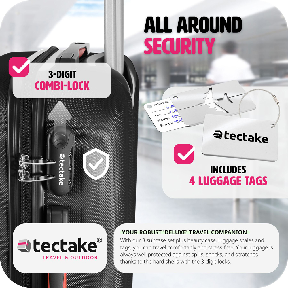 Discover the Cleo Four-Piece Luggage Set from Tectake. This set includes three rolling suitcases, a beauty case, luggage scale and 4 luggage tags, making it a stylish and practical choice for travellers. The suitcases come in any size you need, from cabin-friendly to extra-large, catering to all your travel needs. Each suitcase in this hard-shell set boasts a combination lock, ergonomic telescopic handle and smooth black 360° swivel wheels for effortless handling. The included luggage scale is a boon for air travel, ensuring your bags meet weight requirements. The clever interior design, including compression straps and a divided section with an additional soft mesh pocket, allows for organised packing. These lightweight, durable, and impact-resistant suitcases are perfect for long journeys. Shop now for this stackable luggage set.