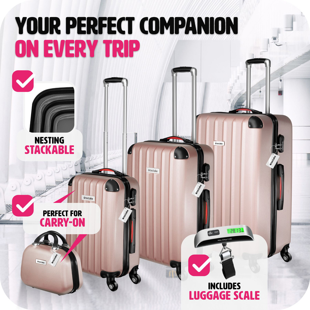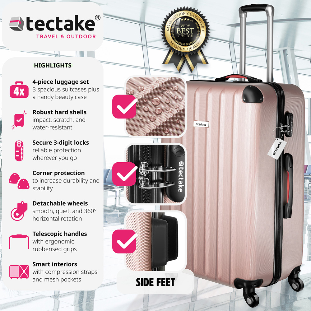 Discover the Cleo Four-Piece Luggage Set from Tectake. This set includes three rolling suitcases, a beauty case, luggage scale and 4 luggage tags, making it a stylish and practical choice for travellers. The suitcases come in any size you need, from cabin-friendly to extra-large, catering to all your travel needs. Each suitcase in this hard-shell set boasts a combination lock, ergonomic telescopic handle and smooth black 360° swivel wheels for effortless handling. The included luggage scale is a boon for air travel, ensuring your bags meet weight requirements. The clever interior design, including compression straps and a divided section with an additional soft mesh pocket, allows for organised packing. These lightweight, durable, and impact-resistant suitcases are perfect for long journeys. Shop now for this stackable luggage set.