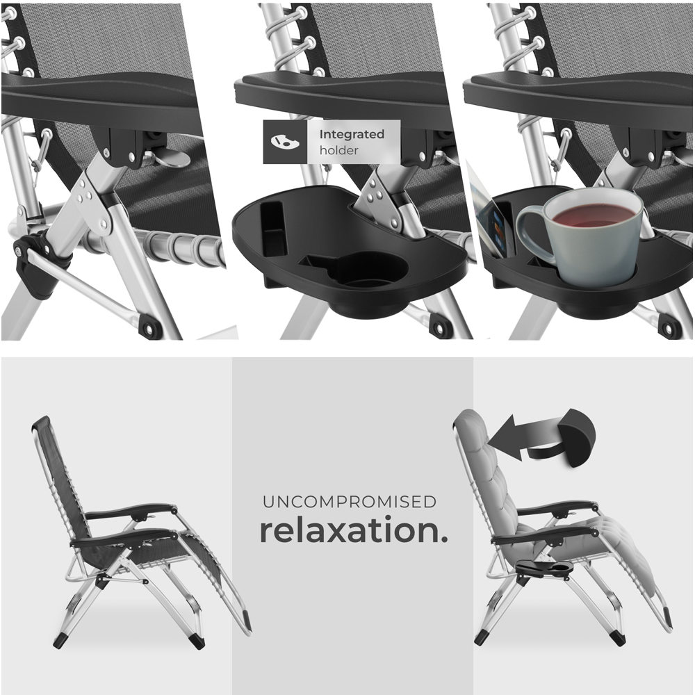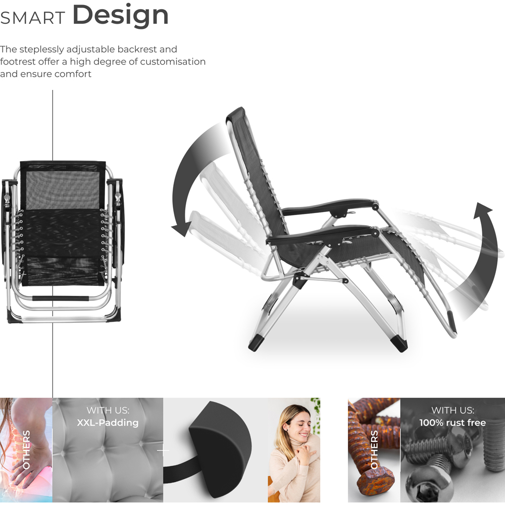 On the foldable sun lounger Cloud by tectake, you can truly relax and enjoy the summer sun. The lounger headrest and the thick, ultra-soft cushioning of the deck chair are removable, allowing you to alternatively relax directly on the breathable Textilene fabric. The chair's infinitely adjustable backrest and footrest provide absolute individual comfort, from sitting to the fully relieving zero-gravity position. A practical side table with recesses for a drink and a smartphone perfectly completes the design of the outdoor furniture. Lounge and enjoy a deeply relaxed summer in your home garden on the sturdy sun lounger Cloud by tectake.