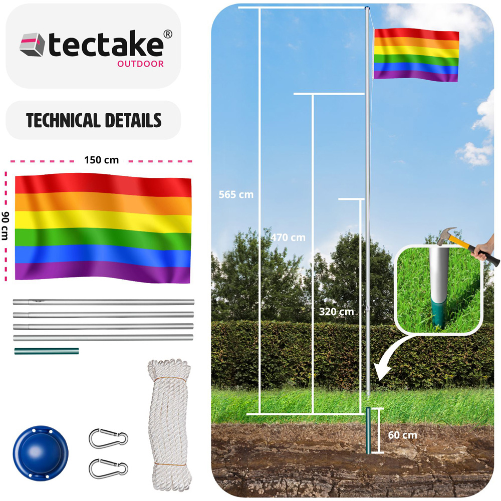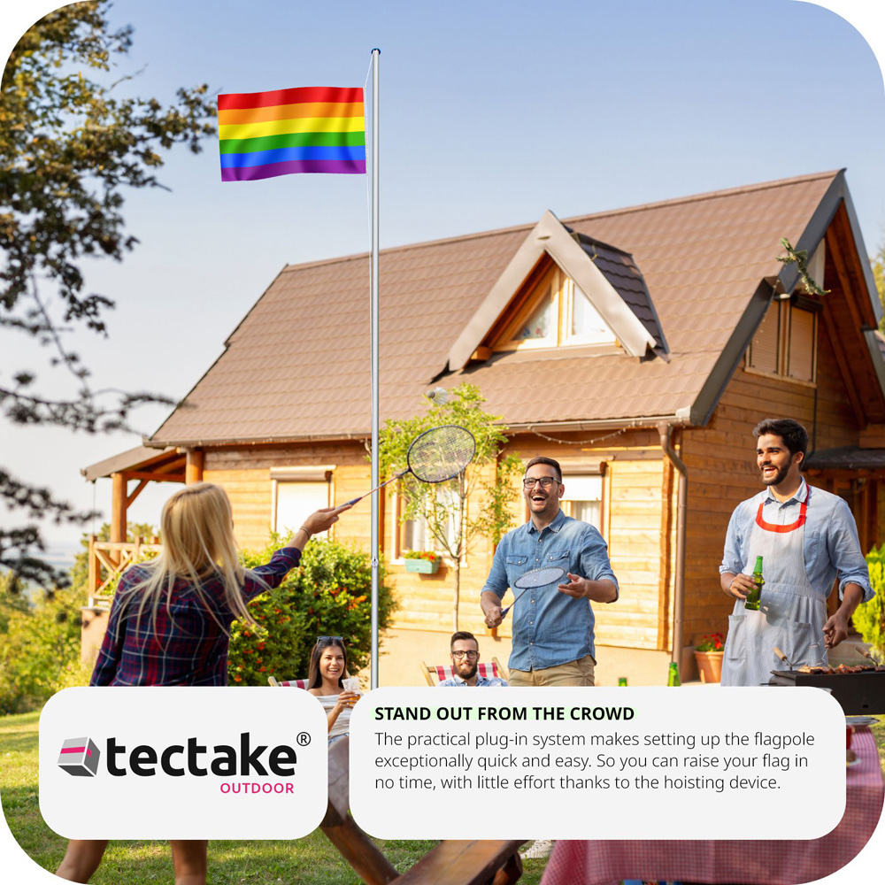 This aluminium flagpole from tectake, is the perfect addition for displaying your favourite banners and national flags. Crafted for durability, these ground mounted flagpoles are easy-to-install, adjustable, and simple-to use. The sturdy construction guarantees a secure display for your national flags, ceremonial bunting or custom business banner at home or work, and these poles promise easy installation. Upgrade your home's exterior with our Aluminium Flagpole for a touch of elegance and a perfect focal point for any occasion. The pole can be set to heights of 320cm, 470cm or 565cm and the included ground sleeve can be set in concrete to ensure a stable position. Thanks to the included rope, you can raise your flag or banner in seconds. Your choice of flag included with each purchase.