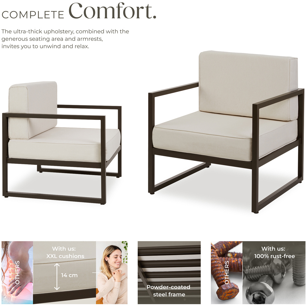 The garden chair Comosa by tectake blends elegant design with unbeatable comfort, making it a perfect addition to your outdoor furniture. With its extra-thick cushions on the seat and back, this chair provides an unparalleled lounging experience, whether placed on your terrace, balcony or in your garden. The powder-coated steel frame ensures incredible stability and load-bearing capacity, while the height-adjustable, floor-protecting feet guarantee a secure stand on any surface, even uneven ones. Crafted with water-repellent polyester covers that are easy to remove and clean, this outdoor chair is perfect for dining or relaxation and remains inviting even in changing weather. Whether as part of your garden table set or as a standalone chair for your outdoor space, the Comosa is a stylish and practical choice for any setting.