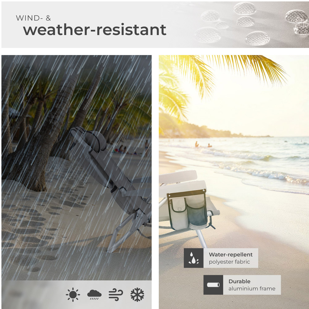 Summer must-have, discover the versatile Coral beach chair from tectake: A true all-rounder that impresses with high functionality and first-class comfort, along with numerous other features. Whether camping, by the sea or relaxing in the garden. Thoughtful, adjustable backrest of the chair allows for an individual sitting or lying position, while the removable head cushion optimally relieves your neck. Thanks to the clever folding function, the outdoor chair can be quickly folded after use and carried like a backpack with the integrated shoulder straps. This not only saves space but also makes transport easier. Charming storage on the back of the backrest, there is a practical storage bag for books, towels and more, as well as a large cooler bag perfect for keeping drinks or snacks handy and fresh. Another highlight is the wide armrests with two additional compartments, providing space for sunglasses, a smartphone or sunscreen. Solid construction beach chair impresses with a weather-resistant frame made of rust-free aluminium, guaranteeing maximum stability and load-bearing capacity. The robust polyester fabric is also particularly water-repellent and easy to clean. Lean back and enjoy soothing outdoor moments with the handy Coral beach chair from tectake.