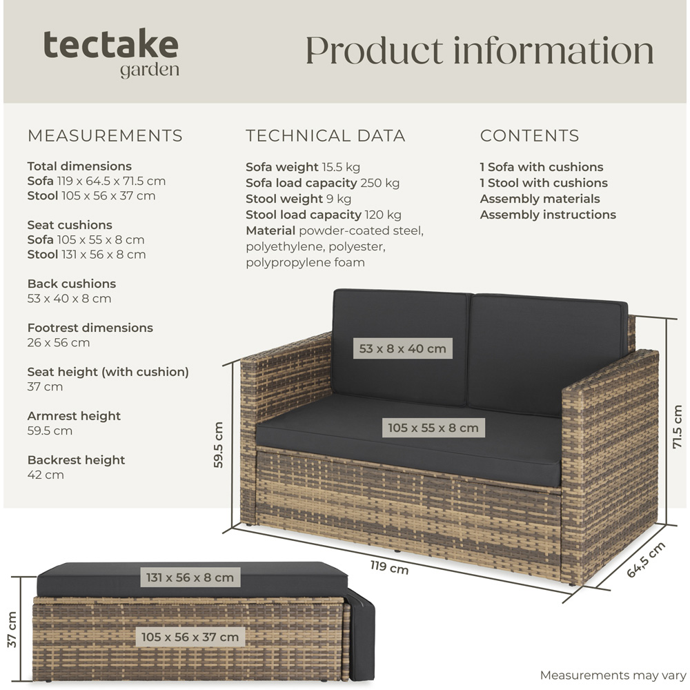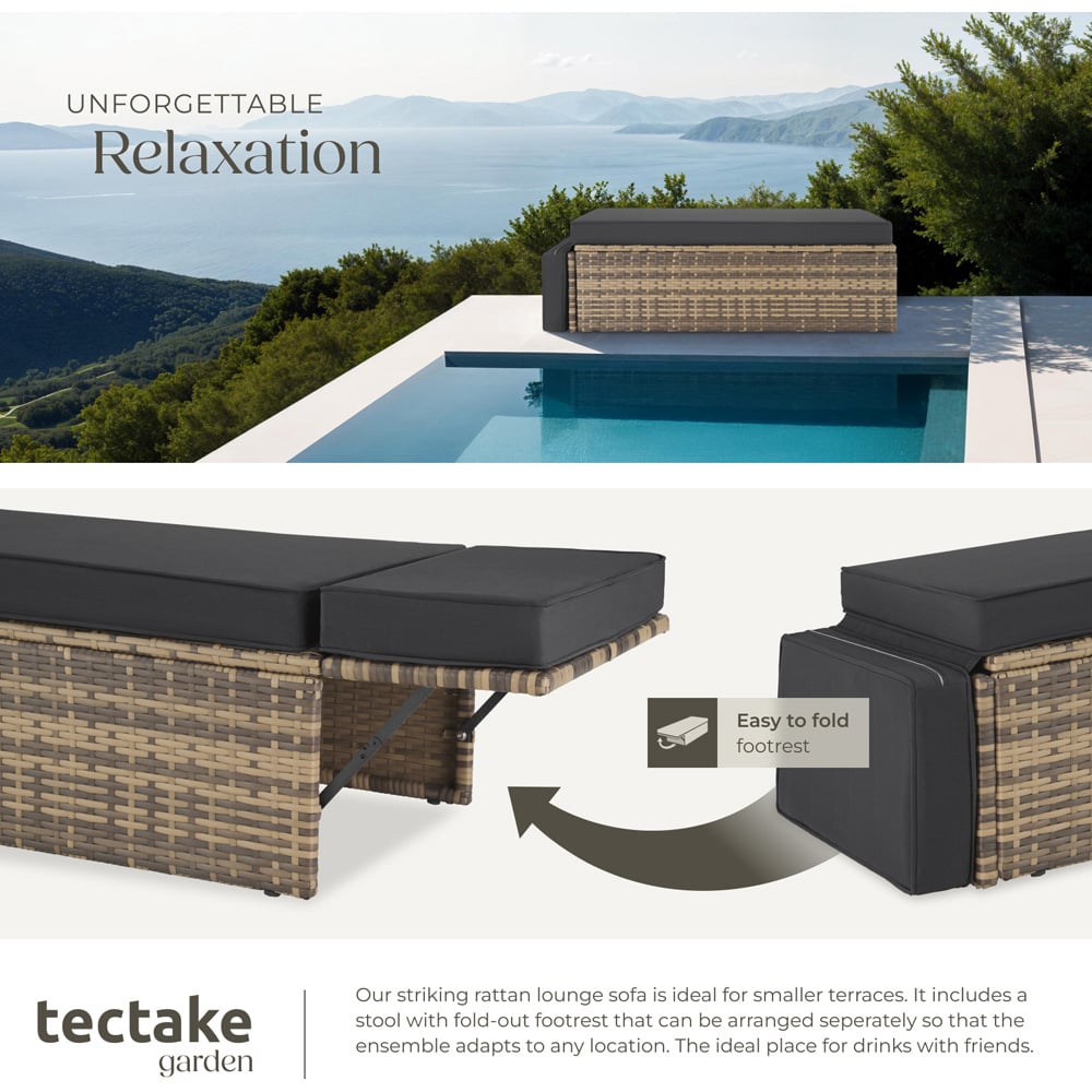 Garden Furniture Corfu: Stylish and Comfortable Outdoor Lounge Transform your outdoor living space with the Garden Furniture Corfu, an exquisite rattan lounge that combines style, comfort, and durability. This premium garden furniture set is designed to create a cozy retreat in your home garden, balcony, or patio. With its UV-resistant polyrattan weave and robust powder-coated steel frame, the Corfu set is built to withstand the elements while maintaining its chic appearance. Garden Table and Chairs: Durable and Modular Design The centrepiece of this garden furniture set is a two-seater rattan sofa, providing ample space for intimate conversations or relaxed lounging. Its sleek design, with dimensions of approximately 119 x 64.5 x 71.5 cm, makes it perfect for smaller spaces without compromising on comfort. The sofa features generous armrests and a high backrest, all complemented by thick, 8 cm soft cushions that are both water-resistant and easy to clean. The cushions ensure you can enjoy your outdoor time without worrying about unexpected weather changes. Rattan Dining Chairs: Versatile Hocker with Foldable Support A standout feature of the Garden Furniture Corfu is its additional long hocker, which offers versatile seating options. The hocker's foldable support enables it to be used horizontally to extend the sofa's seating area or placed separately to accommodate more guests. If you want to relax and stretch out, simply position the hocker vertically and unfold the support to elevate your feet. This modularity makes the set adaptable to various seating arrangements, whether you're hosting a casual gathering or enjoying a quiet afternoon alone. Outdoor Dining: Easy Maintenance and UV Resistance Maintaining the Garden Furniture Corfu is a breeze. The UV-resistant polyrattan ensures that the set retains its vibrant look, even under intense sunlight. Additionally, the water-resistant cushion covers are designed to repel light rain, making cleanup effortless with just a dry cloth. The durable construction of the Corfu set means it will be a staple in your outdoor space for years to come, seamlessly blending practicality with luxury. Enhance Your Home with Garden Furniture Corfu Whether you're looking to create an inviting space for dining, lounging, or socializing, the Garden Furniture Corfu provides the perfect solution. Its stylish design and practical features make it a must-have for anyone looking to enhance their garden furniture collection. Shop now and experience the perfect blend of comfort and elegance that the Corfu set brings to your outdoor living space.