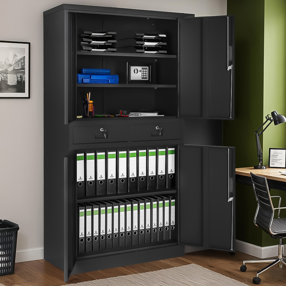 Bring order to your filing and storage system with this lockable filing cabinet from tectake. It features five shelves divided between two compartments, along with two drawers, ensuring your files and important documents remain safe and organized. The cabinet's sheet steel body and doors come with a durable powder-coated finish in a neutral colour, allowing it to easily fit into any room. Designed for both office and home use, this sturdy metal cabinet provides ample storage for files, documents, and essential accessories. Its black finish ensures it complements any furniture arrangement. The lockable doors add an extra layer of security, while its versatile design makes it perfect as a desk companion or a standalone cupboard. This filing cabinet is ideal for professionals and home organizers alike, making it a must-have for maintaining a tidy and efficient workspace.