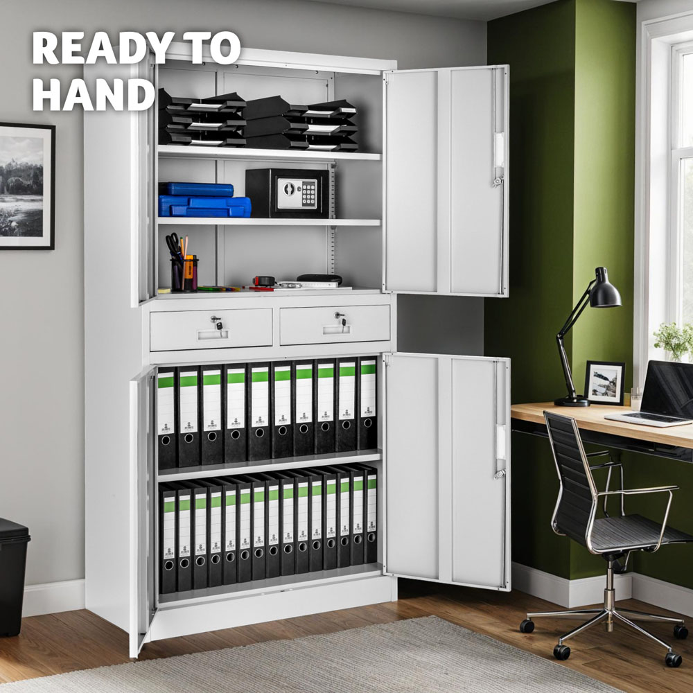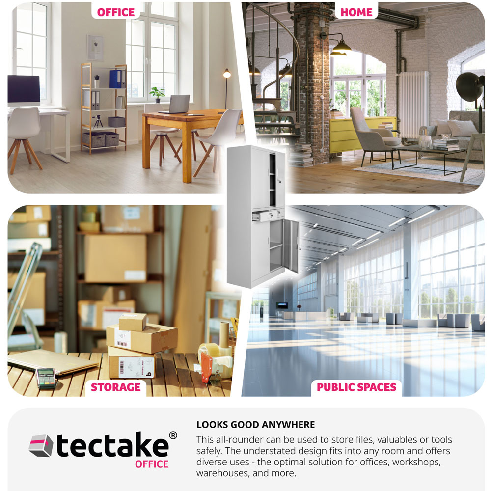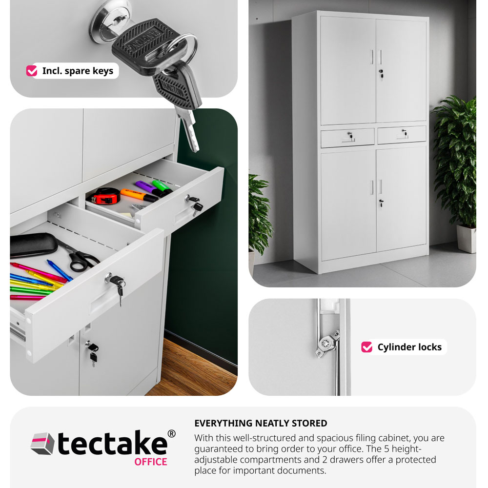 Bring order to your filing and storage system with this lockable filing cabinet from tectake. It features five shelves divided between two compartments, along with two drawers, ensuring your files and important documents remain safe and organized. The cabinet's sheet steel body and doors come with a durable powder-coated finish in a neutral colour, allowing it to easily fit into any room. Designed for both office and home use, this sturdy metal cabinet provides ample storage for files, documents, and essential accessories. Its sleek grey finish ensures it complements any furniture arrangement. The lockable doors add an extra layer of security, while its versatile design makes it perfect as a desk companion or a standalone cupboard. This filing cabinet is ideal for professionals and home organizers alike, making it a must-have for maintaining a tidy and efficient workspace.
