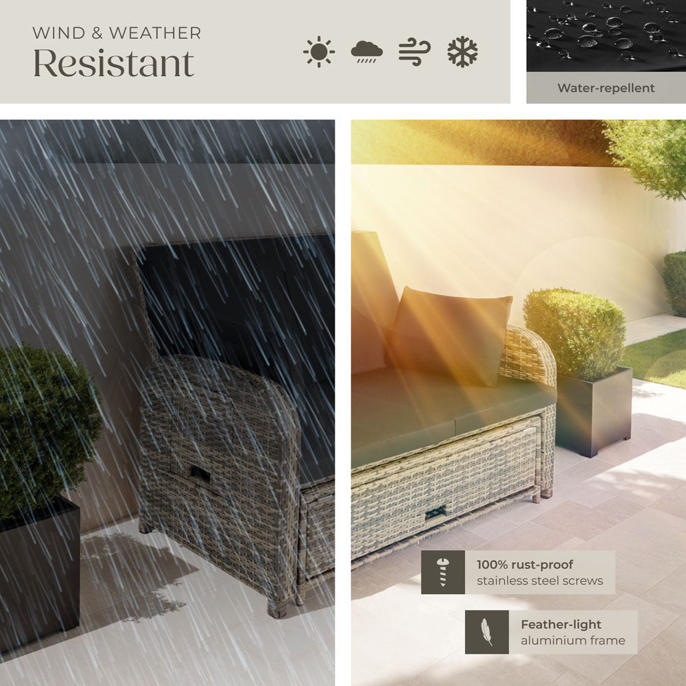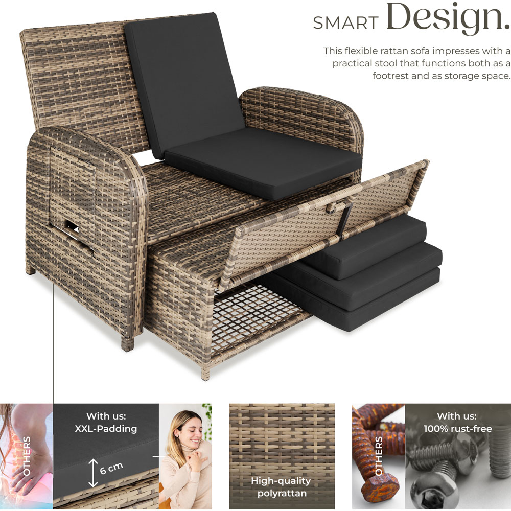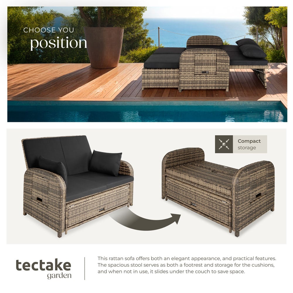 This multifunctional rattan sofa from tectake features extra-soft cushions and an adjustable backrest for optimal comfort. In just a few movements, you can convert this elegant two-seater into an inviting double lounger. The garden furniture set even features fold-out side tables, perfect for holding drinks and snacks. The compact sofa, along with the practical stool with storage space, is delivered already assembled, so they can be put to use on your patio straight away. The set's stool can be used to store the waterproof cushions. The high-quality, durable polyrattan weave and the stable aluminium base make this completely rust-free rattan sofa from tectake the perfect piece of outdoor furniture for your home.