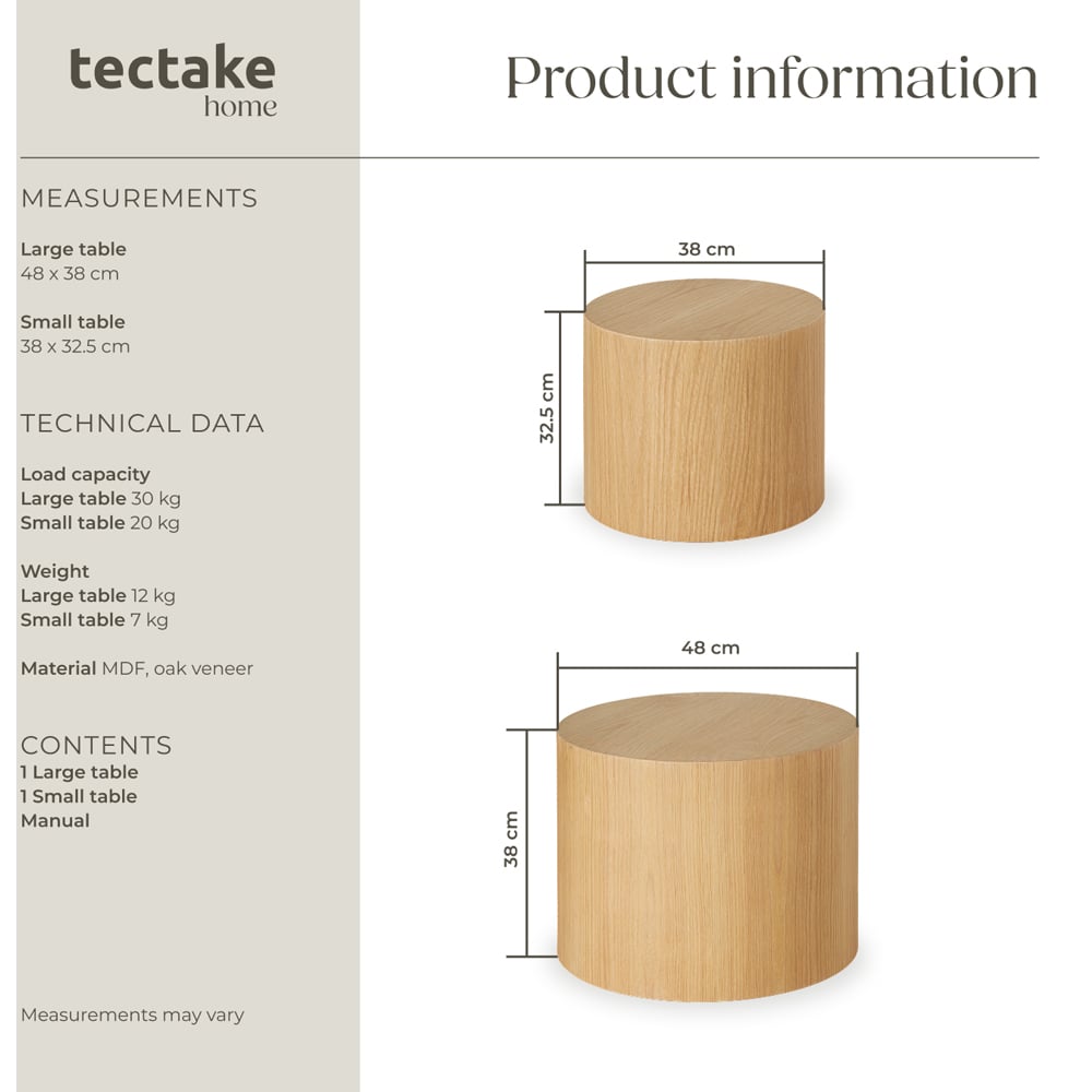Transform your living space with the modern 2-piece set of round coffee tables Danny by tectake. These stylish tables bring together functionality and design, making them a perfect addition to any home. Their round shape and clean lines allow the tables to blend seamlessly into any interior, while adding charming accents that enhance the overall look of your living room or any other room in your home. Crafted from robust MDF and finished with a high-quality oak veneer, these tables not only showcase a beautiful wood effect but also ensure excellent stability and durability. The strong material combination gives these tables superior load-bearing capacity, making them perfect for a variety of uses. For added convenience, each table features non-slip felt floor protectors to guarantee stability on any surface, whether it's your living room or bedroom. These tables come fully assembled and ready to use right out of the box. Simply unpack and enjoy the ease of having stylish furniture without the stress of assembly. The set is ideal for those seeking a practical yet stylish piece of furniture for their home. Whether used as a functional coffee table, elegant storage piece, or even chic plant stands, these round tables offer versatility and will complement any decor. Bring style, and oak elegance into your home with the set of round coffee tables by tectake.