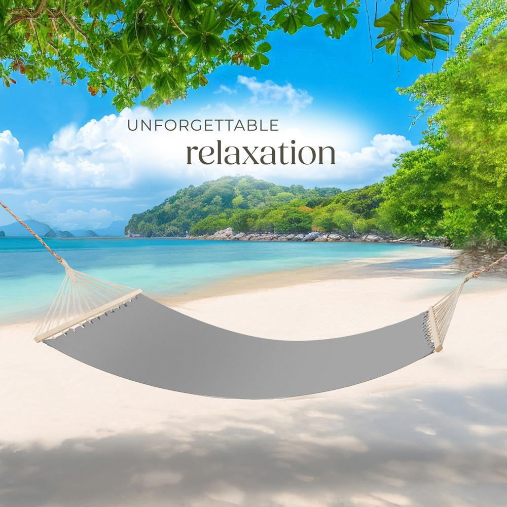 Enjoy moments of pure relaxation with the tectake Eden 2 Seater Light Grey Hammock with Support Bars. Crafted from a high-quality cotton and polyester blend, this back-friendly hammock is both supple and durable. Beechwood rods at the top and bottom keep the fabric taut, making it easy to get in and out. Its spacious design and two soft cushions make it perfect for two people to cuddle up. Ideal for home, camping, or travel.