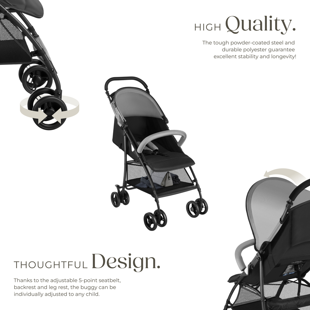 Turn every outing into a smooth adventure with this foldable pushchair featuring a five-point harness and safety bar, perfect for keeping your child secure and comfortable on the go. Enjoy the flexibility of an infinitely adjustable backrest, adaptable footrest and a soft, cosy seat that ensures little ones are snug whether strolling to the playground or exploring the city. The foldable canopy in classic grey offers shade and protection, while a spacious storage basket keeps essentials close at hand. With a sturdy powder-coated steel frame and durable polyester fabric, this pushchair is built for everyday reliability, and its clever folding design means you can pack it away in seconds. Detachable wheels and a foot brake add to the convenience, making travel and storage effortless for busy families seeking a practical yet stylish solution.