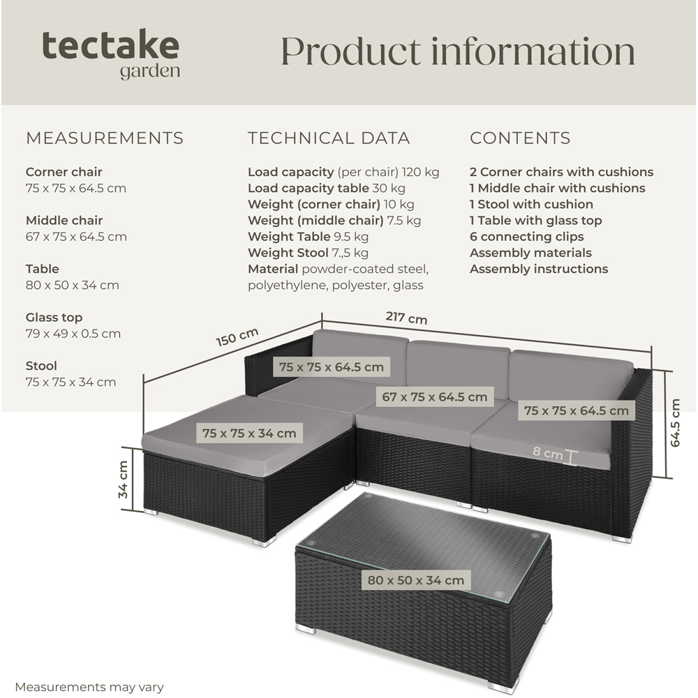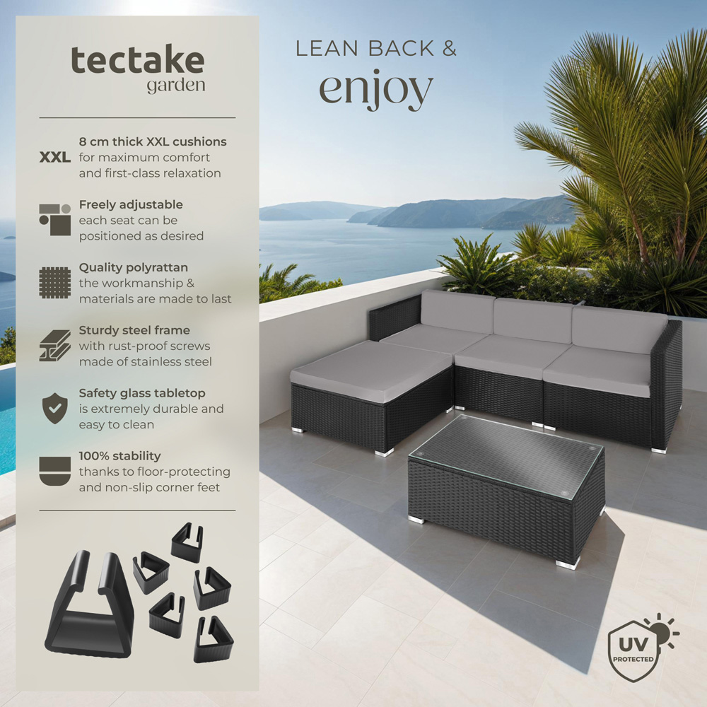 Create a place to chill with this beautiful rattan garden seating furniture set from tectake. The thick, soft cushions are perfect for outdoor relaxing with family. Along with cosiness and the right look, this easy-care set offers stability thanks to a robust steel frame. The individual elements of this functional set can be combined in multiple ways - for example into a lovely comfy sofa with coffee table.
